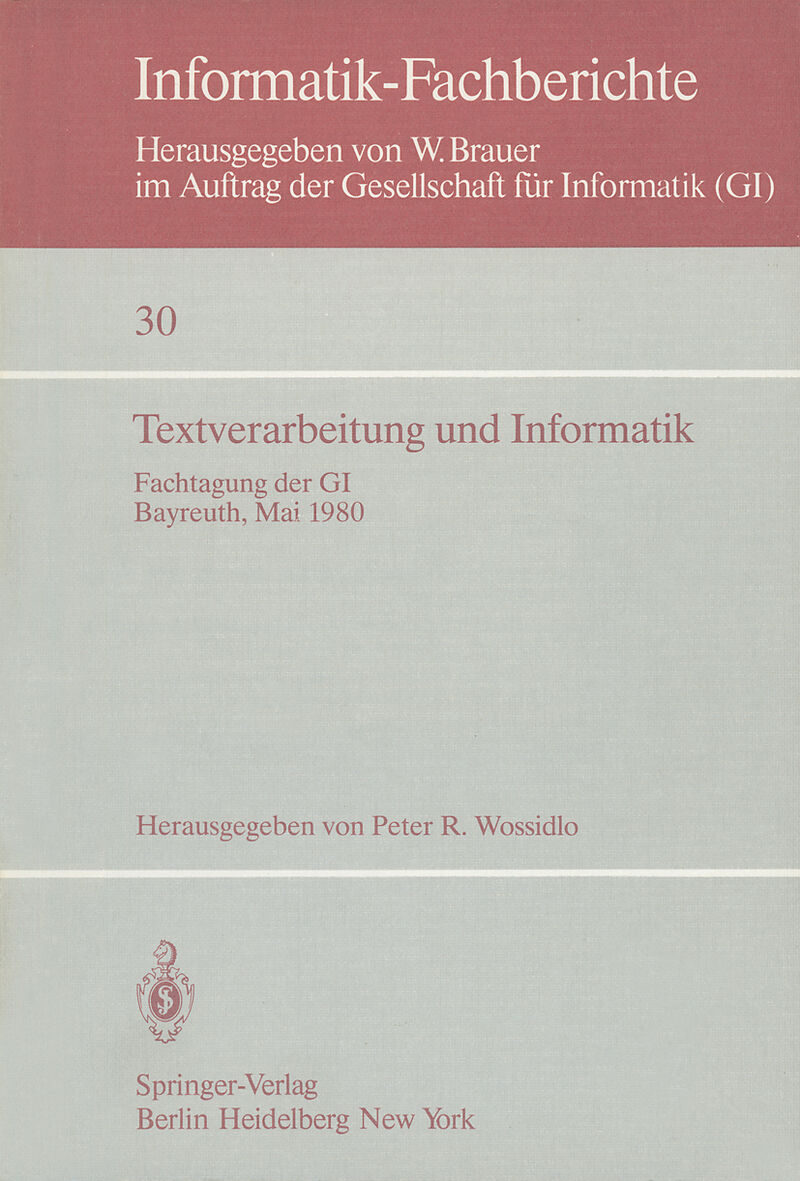 Inhalt Einführung.- Textverarbeitung und Informatik Seite.- Textverarbeitungssysteme.- Cognitive Dimensions of Information Manipulation Systems.- Eine Stack/String/Listen-Maschine für die Textverarbeitung.- Automatische Übertragung von Texten in Blindenschrift...