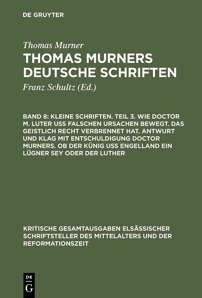 Dieser Titel, "Kleine Schriften. Teil 3. Wie doctor M. Luter uß falschen ursachen bewegt. Das geistlich recht verbrennet hat. Antwurt und klag mit entschuldigung doctor Murners. Ob der Künig uß engelland ein lügner sey oder der Luther", ist eine wissenschaftli...