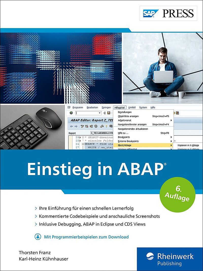 Lernen Sie ABAP schnell und effizient! Mit diesem Standardwerk feiern Sie im Handumdrehen erste Erfolge mit selbst geschriebenem Quellcode. Es behandelt alle relevanten ABAP-Sprachelemente in kompakten Lerneinheiten. Mit kommentierten Codebeispielen, vielen Sc...Lernen Sie ABAP schnell und effizient! Mit diesem Standardwerk feiern Sie im Handumdrehen erste Erfolge mit selbst geschriebenem Quellcode. Es behandelt alle relevanten ABAP-Sprachelemente in kompakten Lerneinheiten. Mit kommentierten Codebeispielen, vielen Screenshots und wertvollen Tipps. Aus dem Inhalt: Erste Schritte im SAP-System ABAP Dictionary und ABAP Editor ABAP Development Tools in Eclipse Felder und Berechnungen Debugging von Programmen Datenbanktabellen und CDS-Views Programmablaufsteuerung und logische Ausdrücke Selektionsbildschirme und SAP Fiori Interne Tabellen Modularisierung von Programmen