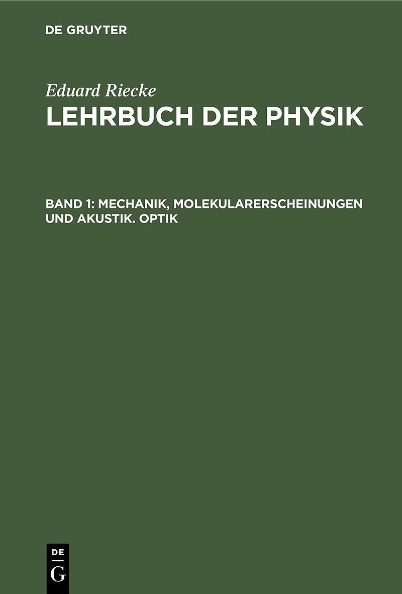 Frontmatter -- Vorwort zur ersten Auflage -- Vorwort zur fünften Auflage -- Inhalt -- Einleitung -- Erster Teil. Mechanik. Molekularerscheinungen. Akustik -- Erstes Buch. Mechanik starrer Körper -- Zweites Buch. Mechanik der Flüssigkeiten und Gase -- Drittes B...