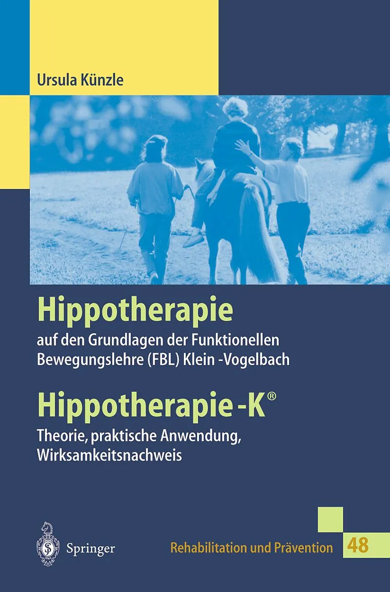 1 Einführung.- 1.1 Terminologie.- 1.2 Entwicklung der Therapien mit Hilfe des Pferdes in der Schweiz.- 1.3 Das Pferd als Therapiepartner.- 1.4 Behandlungskonzept der Hippotherapie-K.- 2 Physiotherapeutische Grundlagen: die Funktionelle Bewegungslehre Klein-Vogelbach.- 2.1 Norm-Funktion des Rumpfes.- 2.2 Abnorme Gleichgewichtsreaktionen.- 2.3 Funktionelles Rumpftraining.- 2.4 Funktionelles Sitztraining mit Hilfe des Pferdes.- 3 Therapiepartner Pferd.- 3.1 Allgemeine Anforderungen an das Pferd.- 3.2 Ausbildung und Haltung.- 3.3 Hippotherapie-K-spezifische Nutzung der Schrittbewegung.- 4 Ausgangsstellung: der Sitz auf dem Pferd.- 4.1 Vergleich: Sitz auf einem Stuhl.- 4.2 Hippotherapie-K-Sitz auf dem Pferd.- 5 Primärbewegung des pferdes.- 5.1 Analyse des Bewegungsimpulses.- 5.2 Zwingende Primärbewegung: der Schub des Pferdes.- 5.3 Subtile Primärbewegung: die mobile Unterlage.- 6 Wirkmechanismen und Anwendungsbereiche.- 6.1 Wirkmechanismen der Primärbewegung.- 6.2 Zielorientierte Anwendungsgebiete.- 6.3 Krankheitsbezogene Anwendungsbereiche der Hippotherapie-K.- Behandlungsstrategie für das Globalziel Sitzbalance.- 7.1 Aufbau der Sitzbalance.- 7.2 Methodisches Vorgehen in Teilschritten.- 8 Übungsstufen der Hippotherapie-K.- 8.1 HTK-Übungsstufe für den Aufbau eines stabilisierten Türmchens.- 8.2 HTK -Übungsstufe für die Aufnahme der Primärbewegung.- 9 Anforderungen an den Patienten.- 9.1 Anforderungen für die Schulung der Sitzbalance.- 9.2 HTK-spezifische Befundaufnahme.- 9.3 HTK-Befundaufnahmen bei klinischen Symptombildern.- 9.4 Befundaufnahme bei einem speziellen Lokalziel.- 9.5 Wegleitung für die Befundaufnahme.- 10 Praktische Durchführung.- 10.1 Aufgaben der Pferdeführerin.- 10.2 Aufgaben der Physiotherapeutin.- 10.3 Hilfsmittel in der HTK.- 11 Aufsteigen auf das Pferd und Absteigen vom Pferd.- 11.1 Aufsteigen.- 11.2 Absteigen/ Absitzen vom Pferd.- 12 Von der Norm abweichende Ausgangsstellung und Reaktionen.- 12.1 Ausgangsstellung auf dem stehenden Pferd.- 12.2 Abnorme Reaktionen auf dem Pferd im Schritt.- 13 Therapeutische Hilfen für die Ausgangsstellung.- 13.1 Hilfe durch Wahrnehmungshinweise.- 13.2 Korrekturmöglichkeiten durch Hilfsmittel: Sattel und Sitzhilfen.- 13.3 Hilfe durch veränderte Beinstellung.- 13.4 Korrekturmöglichkeit ohne Sattel.- 13.5 Therapeutin mit auf dem Pferd sitzend.- 14 Therapeutische Hilfen für den Aufbau des Türmchens und für die Aufnahme der zwingenden Primärbewegung.- 14.1 Ausgangssituation.- 14.2 Hilfen für die Vorstufe.- 14.3 Hilfe für die Übungsstufe 1 (vertikales Türmchen).- 14.4 Hilfe für die Übungsstufe 2 (horizontales Becken-Mobile).- 15 Therapeutische Hilfen für die Aufnahme der subtilen Primärbewegung.- 15.1 Ausgangssituation.- 15.2 Hilfe für die Übungsstufe 3 (frontales Becken-Mobile).- 15.3 Hilfe für die Übungsstufe 4 (transversales Becken-Mobile).- 16 Wirksamkeitsnachweis in der Hippotherapie-K.- 16.0 Ausgangslage des Wirksamkeitsnachweises (Vorstufe): Beurteilung der Ausgangsstellung auf dem stehenden Pferd.- 16.1 Wirksamkeitsnachweis der Stufe 1: Beurteilung der Ausgangsstellung auf dem Pferd im Schritt.- 16.2 Wirksamkeitsnachweis der Stufe 2: Beurteilung der Ausgangsstellung auf dem Pferd im Schritt.- 16.3 Wirksamkeitsnachweis der Stufe 3: Beurteilung der Bewegungsübernahme der subtilen Primärbewegung frontal.- 16.4 Wirksamkeitsnachweis der Stufe 4: Beurteilung der Bewegungsübernahme der subtilen Primärbewegung transversal.- 17 Schweizerische Studie über die Wirksamkeit der Hippotherapie-K bei Multiple-Sklerose-Patienten.- 17.1 Zusammenfassung.- 17.2 Einleitung.- 17.3 Durchführung der Stu die.- 17.4 Ergebnisse.- 17.5 Diskussion und Kommentar zu den Ergebnissen.- 18 Hippotherapie ist nicht gleich Hippotherapie: Ausbildung im deutschsprachigen Raum.- 18.1.1 Deutsches Kuratorium für Therapeutisches Reiten (DKThR).- 18.2 Hippotherapie in Österreich.- 18.3 Hippotherapie-K in der Schweiz.- 19 Literatur.- 19.1 Thema: Entwicklung der Hippotherapie (Kap. 1).- 19.2 Thema: Bewegungslehre (Kap.2).- 19.3 Thema: Umgang mit dem Pferd, Haltung und Schulung (Kap. 3).- 19.4 Thema: Sitz auf dem Pferd (Kap. 4).- 19.5 Thema: Bewegung des Pferdes (Kap. 5).- 19.6 Thema: : Anwendungsgebiete (Kap. 6.2).- 19.7 Thema: Lokalziel Funktionsverbesserung der Lendenwirbelsaule (Kap. 6.2.2).- 19.8 Thema: Hippotherapie-Konzepte (Kap. 18).- 20 Glossar.- 21 Kontaktadre.- 21.1 Internationaler Dachverband.- 21.2 Vereinigungen im deutschsprachigen Raum (alphabetisch).