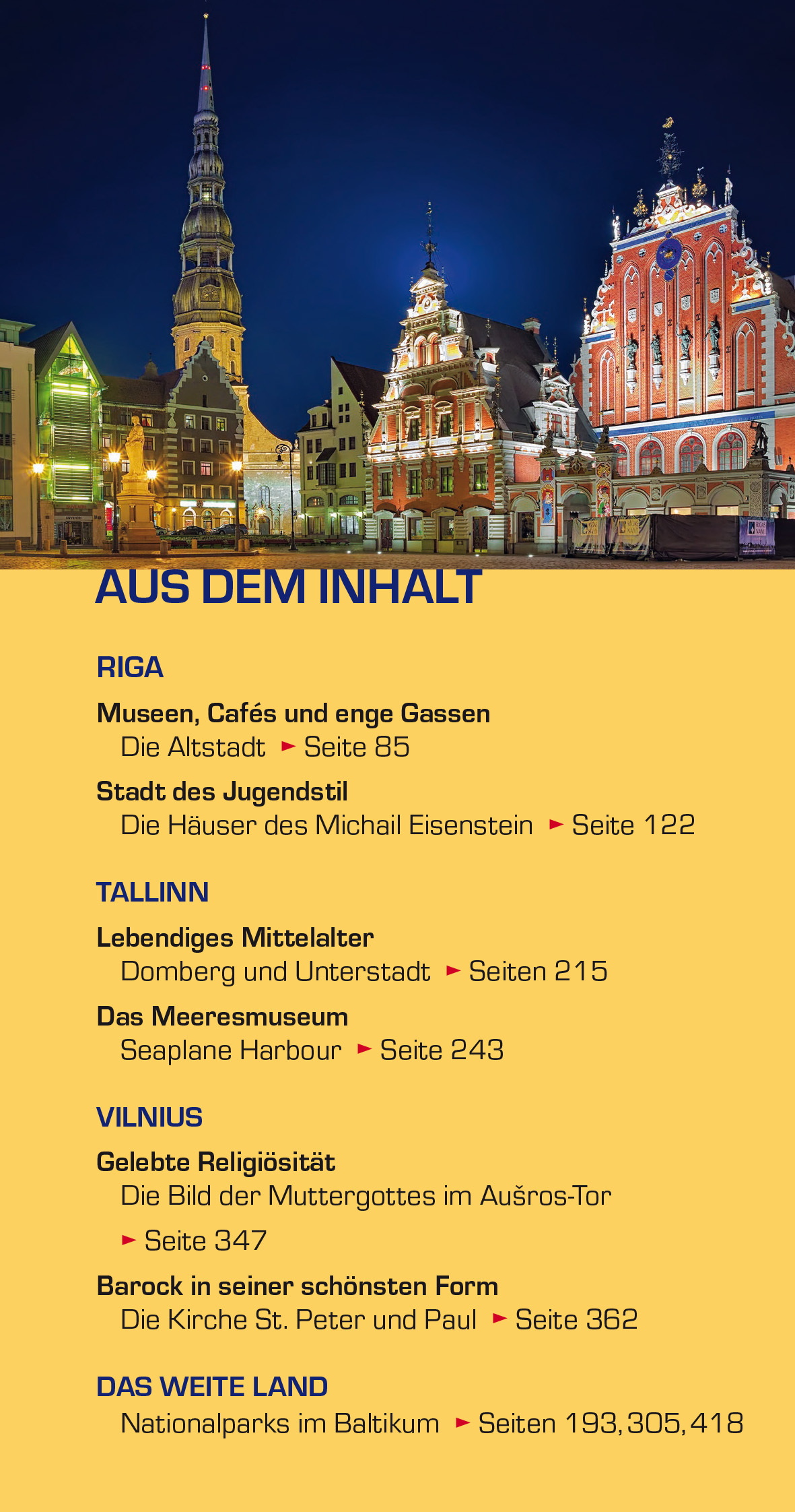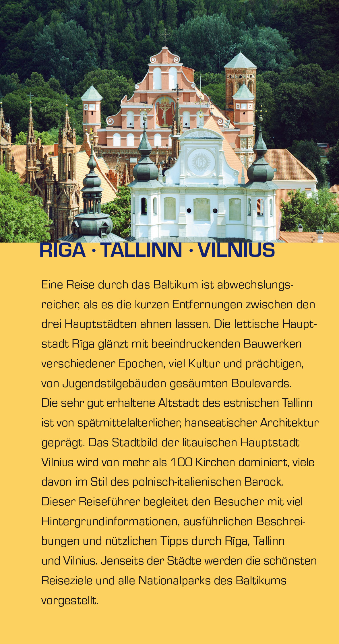 Seite 85STADT DES JUGENDSTILDie Häuser des Michail Eisenstein > Seite 122 T A L L I N N LEBENDIGES MITTELALTERDomberg und Unterstadt > Seiten 215DAS MEERESMUSEUMSeaplane Harbour > Seite 243 V I L N I U S GELEBTE RELIGIÖSITÄTDie Bild der Muttergottes im Auros-Tor> Seite 347BAROCK IN SEINER SCHÖNSTEN FORMDie Kirche St. Peter und Paul > Seite 362 D A S W E I T E L A N D Nationalparks im Baltikum > Seiten 193, 305, 418Eine Reise durch das Baltikum ist abwechslungsreicher, als es die kurzen Entfernungen zwischen den drei Hauptstädten ahnen lassen. Die lettische Hauptstadt Rga glänzt mit beeindruckenden Bauwerken verschiedener Epochen, viel Kultur und prächtigen, von Jugendstilgebäuden gesäumten Boulevards. Die sehr gut erhaltene Altstadt des estnischen Tallinn ist von spätmittelalterlicher, hanseatischer Architektur geprägt. Das Stadtbild der litauischen Hauptstadt Vilnius wird von mehr als 100 Kirchen dominiert, viele davon im Stil des polnisch-italienischen Barock. Dieser Reiseführer begleitet den Besucher mit viel Hintergrundinformationen, ausführlichen Beschreibungen und nützlichen Tipps durch Rga, Tallinn und Vilnius. Jenseits der Städte werden die schönsten Reiseziele und alle Nationalparks des Baltikums vorgestellt.