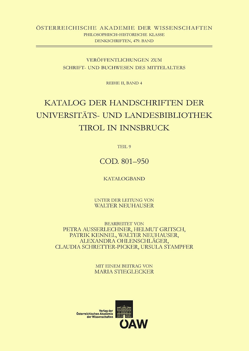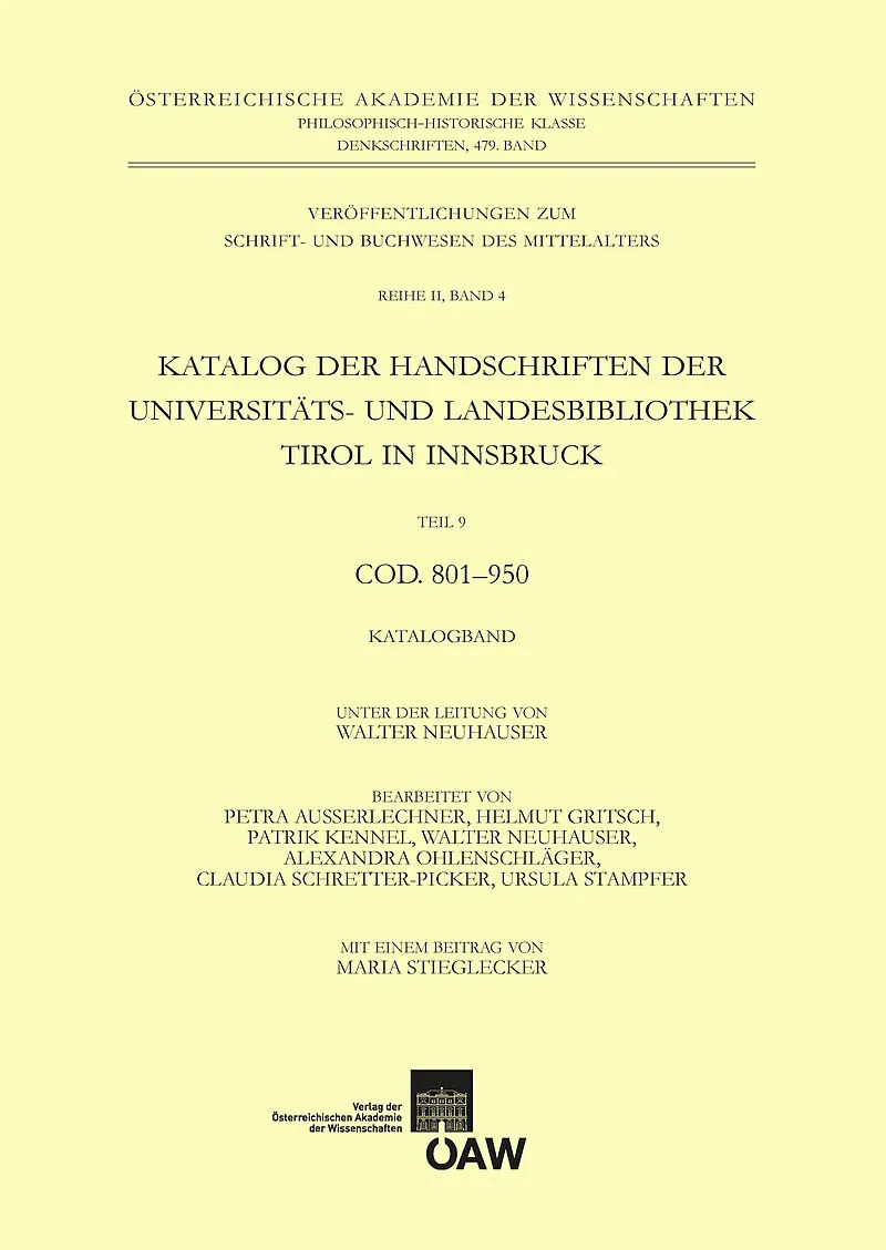 Seit 1987 erscheint ein nach den Richtlinien der Kommission für Schrift- und Buchwesen des Mittelalters der Österreichischen Akademie der Wissenschaften erstellter wissenschaftlicher Katalog der Handschriften der Innsbrucker Universitäts- und Landesbibliothek ...