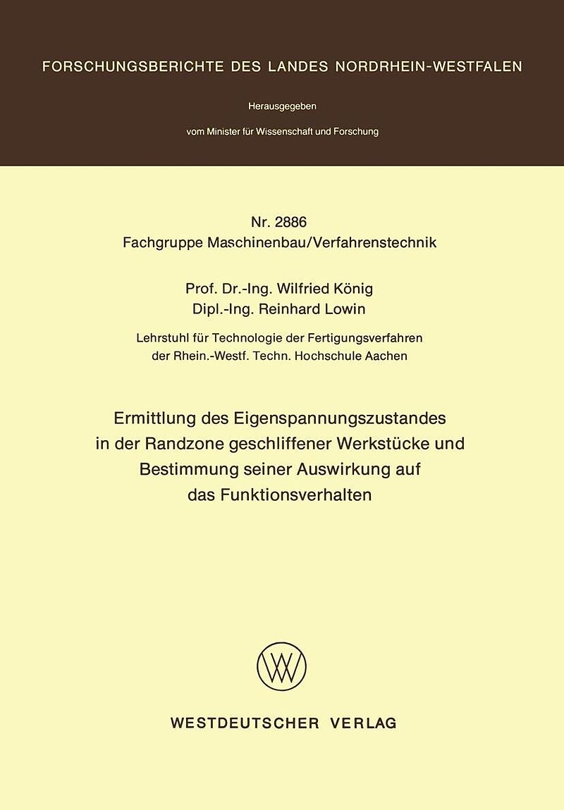 Inhalt 1. Einleitung und Problemstellung.- 2. Eigenspannungen und Dauerschwingfestigkeit.- 2.1 Eigenspannungen.- 2.2 Dauerschwingfestigkeit geschliffener Werkstücke.- 3. Versuchsdurchführung und -Auswertung.- 3.1 Schleifversuche.- 3.2 Eigenspannungsuntersuchun...
