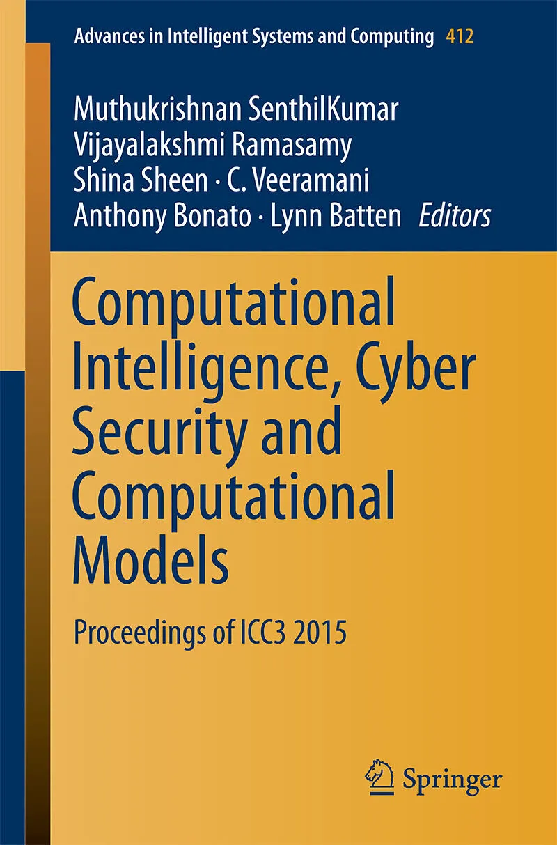 Part I_Keynote Address: 1. The game of Wall Cops and Robbers.- 2. Smartphone Applications, Malware and Data Theft.- 3. Towards Evolutionary Multitasking: A New Paradigm in Evolutionary Computation.- 4. Generating a Standardized Upper Ontology for Security of Information and Networks.- Part II_Computational Intelligence: Chapter 1. Analysis of Throat Microphone Using MFCC features for Speaker Recognition.- Chapter 2. Single-pixel Based Double Random-Phase Encoding Technique.- Chapter 3. Kernel Online Multi-task Learning.- Chapter 4. Performance Evaluation of Sentiment Classification Using Query Strategies in a Pool Based Active Learning Scenario.- Chapter 5. An Enhanced Image Watermarking Scheme Using Blocks with Homogeneous Feature Distribution.- Chapter 6. Performance Analysis of ApEn as a Feature Extraction Technique and Time Delay Neural Networks, Multi-layer Perceptron as Post Classifiers for the Classification of Epilepsy Risk Levels from EEG Signals.- Chapter 7. Suspicious Human Activity Detection in Classroom Examination.- Chapter 8. H * *State Estimation of Discrete Time Delayed Neural Networks with Multiple Missing Measurements Using Second Order Reciprocal Convex Approach.- Chapter 9. A Fuzzy Methodology for Clustering Text Documents with Uncertain Spatial References.- Chapter 10. A Novel Feature Extraction Algorithm from Fingerprint Image in Wavelet Domain.- Chapter 11. Motor imagery Classification Based on Variable Precision Multigranulation Rough Set.- Chapter 12. Fault Tolerant and Energy Efficient Signal Processing on FPGA Using Evolutionary Techniques.- Chapter 13. A Two Phase Approach for Efficient Clustering of Web Services.- Chapter 14. Elimination of Redundant Association Rules An Efficient Linear Approach.- Chapter 15. Clustering Techniques from Significance Analysis of Microarrays.- Chapter 16. Breast Region Extraction and Pectoral Removal by Pixel Constancy Constraint approach in Mammograms.- Chapter 17. Bridging the Semantic Gap in Image Search via Visual Semantic Descriptors by Integrating Text and Visual Features.- Chapter 18. Adaptive Equalization Algorithm for Electrocardiogram Signal Transmission.- Chapter 19. An Efficient Approach for MapReduce Result Verification.- Chapter 20. Improving Lifetime of Memory Devices Using Evolutionary Computing Based Error Correction Coding.- Chapter 21. Comparison of Machine Learning Techniques for the Identification of the Stages of Parkinson's Disease.- Chapter 22. Security Constrained Unit Commitment Problem Employing Artificial Computational Intelligence for Wind-thermal Power System.- Chapter 23. Human Gait Recognition Using Fuzzy Logic.- Chapter 24. …