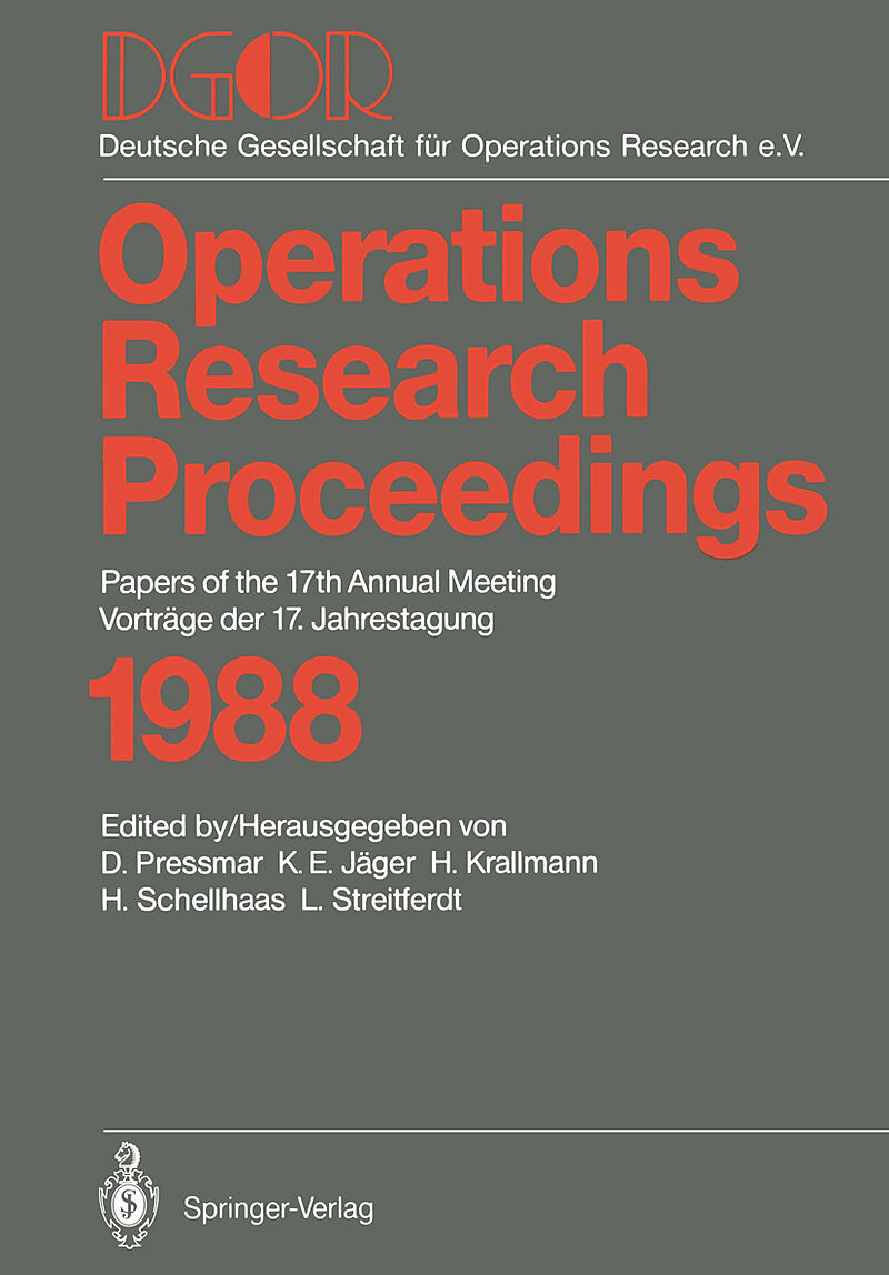 Eröffnungsvortrag.- Informatik im Wandel: Bedeutung für die Industrie.- Plenarvorträge.- Kombinatorische Optimierung und Anwendungen.- Mathematical Programming.- KI-Anwendungen und Expertensysteme.- Verbindung von klassischen OR-Verfahren und Al-Techniken bei Scheduling-Problemen.- Diagnostics in Production Flow Analysis.- Zur Verbindung von wissensbasierter Modellierung und What-if-Planung.- Ansatz einer Expertensystem-Entwicklung zur jahresabschlußorientierten Kreditwürdigkeitsprüfung und -überwachung - Eine Untersuchung der intertemporalen Prognosestabilität im Vergleich zu multivariaten Diskriminanzanalysen.- Eine Entwicklungsumgebung für Expertensysteme zur Zeitreihenanalyse.- Professor Higgins - der persönliche Informationsmanager.- Decision Support Systems und Planungssprachen.- FCS ein modernes System zur Entscheidungsunterstützung des Vorstandes.- Das strategische Informationssystem IFPS.- DV-technische Hilfsmittel zur Absatzplanerstellung in einem System der integrierten Unternehmensplanung.- Zum Einsatz einer Planungssprache für Anwendungen im Bereich der strategischen Unternehmensplanung.- PC-Planungssprachen als Generatoren für Decision Support-Systeme.- Entscheidungsunterstützung und Informationsstrukturen am Beispiel eines.- KDS - Ein System zur Entscheidungsunterstützung in der Energiewirtschaft.- Eine Modellierungssprache für Netzwerkflußmodelle.- Mixed Integer Models of the Business Process and Disjunctive Goals.- Project Scheduling with Antagonistic Preferences.- Erfahrungen aus der Implementierung OR-gestützter Entscheidungsunterstüt-zungssysteme.- Anwendungsberichte aus der Praxis.- Optimierung der nationalen Energieversorgung des Entwicklungslandes Indonesien.- Optimierung des Kraftwerkeinsatzes in der elektrischen Energieerzeugung.- Entwicklung eines DV-Systems zur Verrechnung und Planung von DV-Leistungen.- Erfahrungen beim Einsatz eines Decision Support Systems zur Planung chemischer Produktion.- It Takes Two to Tango: Just-In-Time in the Chemical Industry.- Entwicklung eines integrierten Programmsystems zur Unterstützung bei Warentermingeschäften in APL.- Praxisgerechte Zuschnittoptimierungen für Flachglas und Spanplatten.- DV-Unterstützung von Strukturänderungen beim Einsatz von Planungsmodellen im Controlling.- Bildung von Mitarbeiterbezirken für einen Außendienst.- OR im Personal Computing.- PC - gestützte strategische Produktplanung.- PRISM - Risikoanalyse zur Beurteilung von Investitionen.- TourMaster - Ein PC-Tourenplanungssystem zum Einsatz in Lehre und Praxis.- Simulation und Simulationswerkzeuge.- Entwicklungstendenzen in der Simulationstechnik.- Die Modellbeschreibungssprache SIMPLEX-MDL.- Simulative Projekt- und Prozeßplanung mit Ressourcenmanagement.- Systementwurf durch Evaluierung von Modellen in Form von Prädikats-Transitionsnetzen.- Planung und Simulation flexibler Produktionssysteme mit Petri-Netzen.- Objektbasierte Simulation eines fahrerlosen Transportsystems in Modula-2.- Simulationsanalysen von Innovationsstrategien.- TIGER: A Programming Tool for Interactive and Graphical Evaluation of Reliability.- Simulationsmodell zur experimentellen Berechnung des elektrischen Leistungsbedarfs und seiner zeitlichen Verteilung bei Haushalten.- Softwaresysteme zur Mathematischen Optimierung.- Ein computergestützter Ansatz zur gemischt-ganzzahligen Optimierung unter Berücksichtigung logischer Beziehungen zwischen den Variablen.- Basis Representations in Large-Scale Linear Programming Software.- Design and Implementation of a Fast and Portable LP-Optimizer.- Verfahren zur Mathematischen Optimierung.- Vehicle Routing and Scheduling: Theory and Practice.- Einige Bemerkungen zur Lösung "großer" Travelling Salesman Probleme in der flexiblen Fertigung und Großserienfertigung.- Stronger Bounds for the Quadratic Assignment Problem.- An LP-Approach for Minimizing Mean Finish Time.- Dual Ascent Using Valid Inequalities for the Directed Steiner Tree Problem.- Variations on Matchings.- Ein Verfahren zur Lösung großer Matching-Probleme.- Improving Lagrangean Decomposition: The Case for the Matching Problem with Gub Side Constraints.- Placement of Telecommunication Satellites in the Geostationary Orbit.- Erfahrungen mit neuen Ansätzen zur Lösung des Max-Flow-Problems.- Primale Maxflow-Simplex-Verfahren mit erweiterter Netzwerk-Datenstruktur.- Optimumgraphen zur Analyse linearer Optimierungsprobleme unter Entartung.- Kombinatorische Optimierung.- Independent Covers in Planar Graphs.- On a Degree Constrained Steiner Problem in Graphs.- Polynomial Algorithmen zum Testen eines Eindeutigkeitskriteriums für elektrische Netzwerke.- Interior and Exterior Methods of Linear Programming.- On the 0-1-Maximization of Positive Definite Quadratic Forms.- Ein Algorithmus zum Fixkostenproblem.- New Bounds for the One Machine Scheduling Problem to Minimize Total Weighted Waiting Time.- Heuristische Algorithmen zur Tageseinsatzplanung bei einer Fluggesellschaft.- A Dual Algorithm for the Economic Lot-Sizing Problem.- Zuverlässigkeits- und Bedienungstheorie.- Multi-Queue Systems with Cyclic Service Strategies.- The Discrete-Time Single Server Queueing Model.- Zur zentralen Bedeutung der Spitzeridentität in der Damm- und Bedienungstheorie.- An Elementary Proof of a Basic Result for the GI/G/1 Queue.- Sojourn Times in Feedback Queues.- Performance Predictions for the Upgrading of a VAX-Cluster.- A Simple Algorithm for the System Reliability in the 1-out-of-n System with Exponential Repair Times.- Simultaneous Busy Periods for Nodes in a Stochastic Network: Computational Algorithms.- Fault Trees for Minimum Flow Rates between Pairs of Nodes in Digraphs.- Extremwerte von Funktionen von Vektorenprozessen.- Some Results on the Joint Distribution of the Renewal Epochs Prior to a Given Time Instant.- Kontrolltheorie.- Differentialspiele: Theorie und ökonomische Anwendungen.- Qualitative Analysis of Hierarchical Equilibria in Differential Games.- A Note on 
