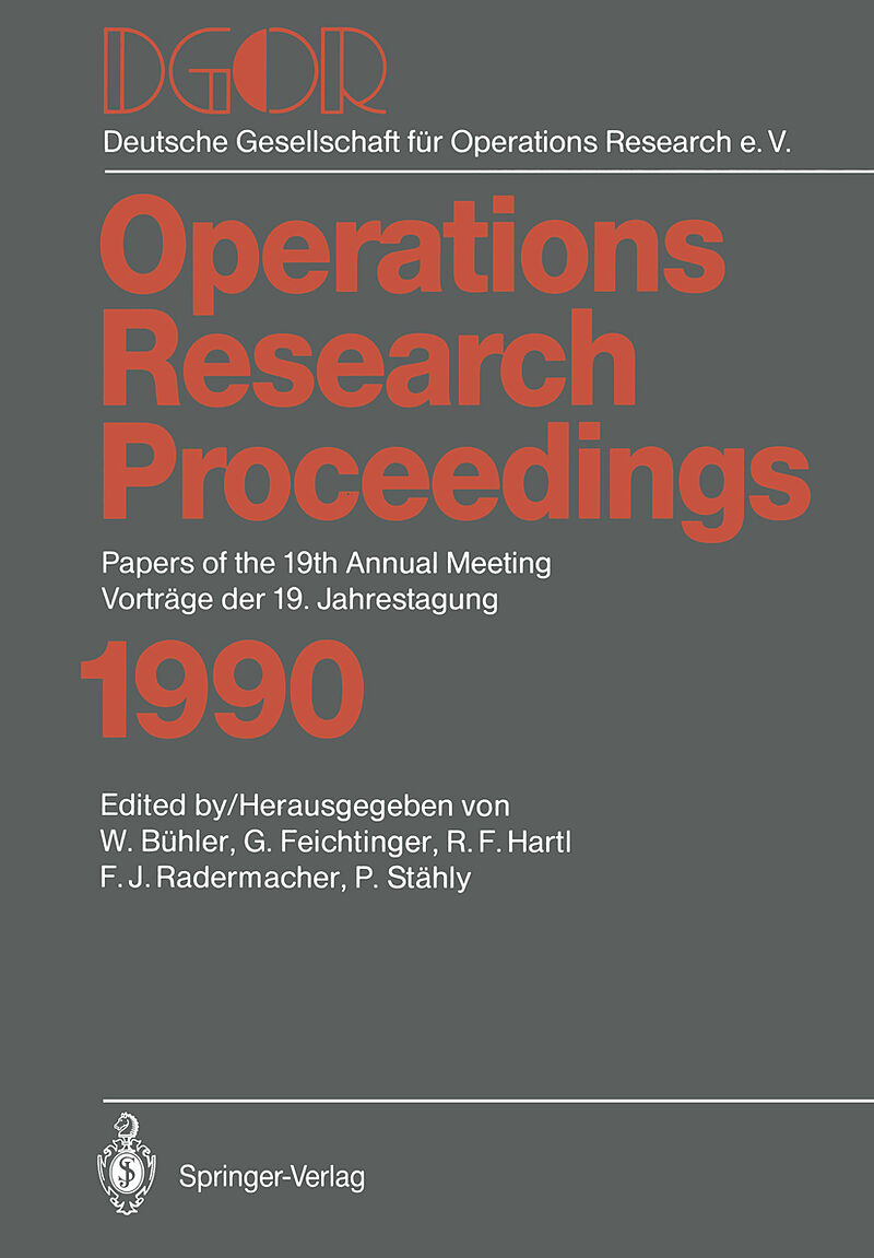 Plenary Lecture.- Innovation management and Operations Research.- Linear and Stochastic Optimization and Degeneration Problems.- The implementation of interior point methods for solving LP on PC.- An optimum concept for fuzzified linear programming problems.- PAM: A new and non-procedural way to build LP models.- A probabilistic algorithm to solve linear programming problems.- Stochastic stability concepts.- Stochastic recursive algorithms for optimization in a Hilbert space.- Degeneracy in mathematical programming and degeneracy graphs - A concise version of a tutorial.- Heuristics for determining a minimal set of informative nodes in the optimum degeneracy graph.- On the theory of degeneracy graphs.- Monte Carlo studies of eigenvalue problems in static and dynamic Leontief models.- Nonlinear Optimization.- Reciprocity in optimization and efficiency in the bicriteria problem: A unified approach.- Parametric orders and generalized convexity for nonlinear programming.- A method for the minimization of a quadratic convex function over the simplex.- Quasi-Newton interior points algorithms for nonlinear constrained optimization.- Structural Pareto optima in nonlinear multiobjective programming.- PADMOS, ein MS-DOS-Programm für nichtlineare Optimierung mit automatischem Differenzieren.- Existence and approximation results for Min Sup problems.- On strict epsilon-solutions for a two-level optimization problem.- Stochastic Models of or.- Optimal routing of customers to parallel service groups.- Sensitivitätsanalyse in ökonomischen Modellen mit der Perturbationsanalyse.- A solution for the variance-penalized Markov decision problem based on parametric linear programming.- Dynamic programming for classification problems.- Decision Theory and Dynamic Systems.- Neuere Entwicklungen auf dem Gebiet der Vektoroptimierung - Ein Überblick.- Impossible relationships.- Graphische Entscheidungsunterstützung bei Mehrzielproblemen.- Control Theory and Dynamic Systems.- Modelling for optimization and control of systems - A tutorial review.- Asymptotic optimality in hierarchical control of manufacturing systems under uncertainty: State of the art.- Robust optimal policy methods for nonlinear models.- Synergetic aspects in economic modelling.- Chaotic consumer behavior.- Combinatorial Optimization, Transportation and Routing.- Computing the lengths of shortest paths in Zn.- The traveling salesman problem with precedence constraints.- Upper and lower bounds for the symmetric 2-peripatetic salesman problem.- Dynamic traffic assignment models.- Solution of large-scale multicommodity network flow problems via a logarithmic barrier function decomposition.- Subtour elimination algorithm for the capacitated arc routing problem.- Expert Systems and Artificial Intelligence.- Computer-based development of corporate strategies - Integration of knowledge-based and conventional system components.- Executive information systems (EIS): State-of-the-art und Zukunftsperspektiven.- XARCOS - An expert system for risk analysis.- Die Behandlung aller logischen Abhängigkeiten in lernenden Inferenznetzen.- Profile of the first generation of marketing expert systems.- Production.- Solution to scheduling problems based on configurations.- Dynamic learning augmented production planning models.- Ein Ansatz für eine allgemeingültige Theorie der Fertigungssteuerung.- Lot sizing in group technology cells.- Project scheduling under resource constraints and maximum time distances.- Minimizing changeover costs: The one machine case.- A Lagrangian heuristic for multilevel lotsizing.- Einlastungsstrategien für ein flexibles Fertigungssystem.- A heuristic approach to integrated capacity and lot size planning (A case study).- Ein Verfahren zur Produktionsglättung unter Berücksichtigung von Produktions-, Rüst- und Lagerkosten.- Prioritätsregeln zur Ressourcenplanung in MPM-Netzplänen.- Project Management.- PROMICS - Ein Management-Informations- und Controllingsystem für den Forschungs- und Entwicklungsbereich.- Simulation von Software-Entwicklungsprojekten.- Logistics and Inventory.- Ein Verfahren zur Bestellmengenplanung bei beschränkter Lagerkapazität.- Entscheidungshorizonte im dynamischen Losgrößenmodell bei mehreren Produkten.- Der Einfluß von Preisschwankungen auf die optimale Bestellpolitik.- Reorganisation der Logistikstruktur eines Versandhauses auf der Basis der mathematischen Optimierung.- Die Optimierung eines mehrstufigen Lagersystems: Eine Fallstudie aus dem Holzhandel.- AI application to logistics decision support systems.- Finance.- Zinsänderungsrisiko, Bonitätsrisiko, und Hedging bei zinsfix/-variabel kontrahiertem Kreditgeschäft.- Statistische Analyse deutscher Optionsscheinkurse.- An investment strategy for European stock option trading.- Zur Berücksichtigung der Irreversibilität in finanzwirtschaftlichen Entscheidungsmodellen.- Industrial Mathematics.- Mathematical models in chemical engineering.- A cutting plane algorithm for the design of survivable networks.- Die Anwendung der Mehrzielmethode zur Optimierung von elastischen Stäben.- Public Services.- Risikoanalytische Berechnung der Stromkostenbelastung von Haushalten bei verschiedenen Tarifmodellen.- Wirtschaftlichkeitskontrolle im Gesundheitswesen durch Einsatz von Expertensystemen.- Decision support for Tanzanian Aids policy.- Liste Aller Gehaltenen Vorträge.- Verzeichnis Der Vortragenden.