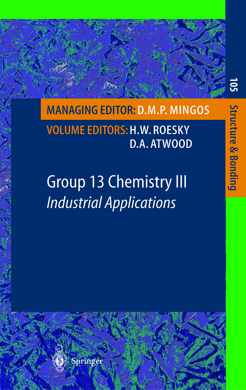 The present issue of Structure and Bonding is dedicated to applied group 13 chemistry, particularly for the elements boron and aluminum, and to a lesser degree gallium and indium. Although boron is a trace element (0.01 g kg 1) in the earth's crust, it has be...