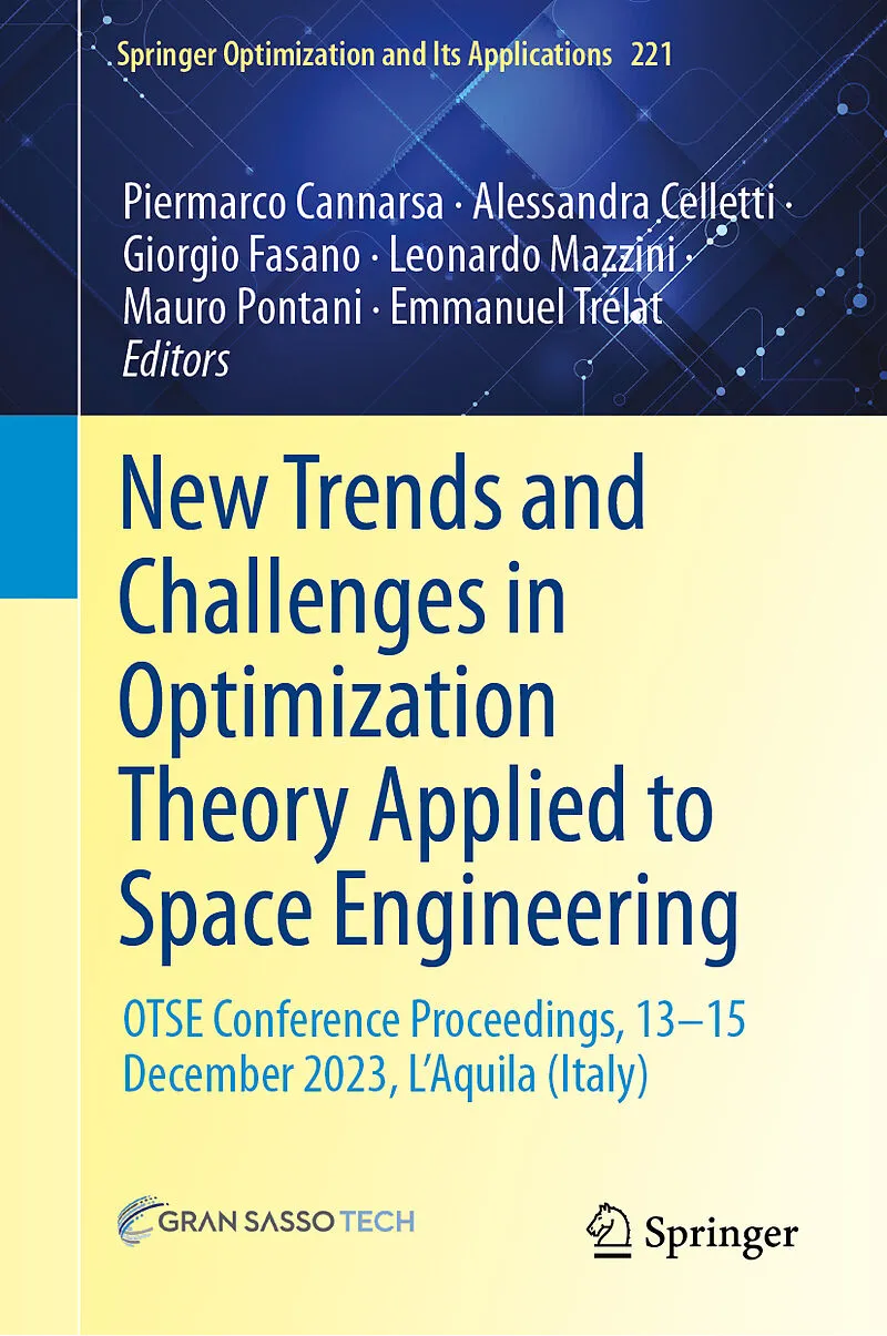 The book consists of the proceedings of the workshop "New Trends and Challenges in Optimization Theory Applied to Space Engineering", held in l'Aquila (Italy), and organized by the Gran Sasso Science Institute (GSSI), on December 13-15, 2023. The main purpose...