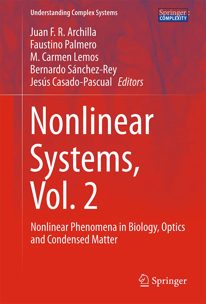 Juan F. R. Archilla: Prof. Juan F.R. Archilla obtained his PhD in Physics in 1992 in the Department of Atomic, Molecular and Nuclear Physics of the University of Sevilla, Spain. Presently he is professor in the Department of Applied Physics I of the University of Sevilla, Spain. His lectures in Mechanics and Electromagnetism take place at the Higher Technical School of Computer Engineering in the degrees of Health Engineering and Computer Engineering. His research has been in different aspects of Nonlinear Science, some more theoretical as symmetry and bifurcation theory with application to reaction diffusion systems and some more applied as localized nonlinear waves, reaction rate theory, defects in semiconductors and breathers and kinks in crystals and biological systems as DNA and proteins; or neutron spectroscopy of nonlinear vibrations. Lately he has been involved in experiments to detect nonlinear excitations. He is the head of the Research Group of Nonlinear Physics of the University of Sevilla and member of the European Physical Association. He is a frequent referee in international journals, including Springer journals. Prof. Archilla has been guest researcher in several universities as Freie Univerität in Berlin; Cambridge and Heriot-Watt Universities in the UK; Denmark Technical University in Lyngby, Denmark; LADIR (CNRS) in Paris, France; Tartu University in Estonia; and Osaka University in Japan. He participated in experimental work in the ISIS spallation neutron source at the Rutherford Appleton Laboratory in the UK. He has taken part in the organization of several international conferences, the most recent ones in Altea (Spain, 2013, as chairman); Ufa (Russia, 2015) and Sevilla (Spain, 2016) and the next one to be held in Kyoto (Japan, 2018). Prof. Archilla has written about 60 scientific publications in international journals and books. He has been the main editor of a recent volume in Springer Series in Materials Science: Quodons in Mica, Nonlinear Localized Travelling Excitations in Crystals (2015). Some relevant articles in journals are: Nonlinear charge transport mechanism in periodic and disordered DNA, Physica D (2003), where DNA was proposed as a biological wire; Demonstration of the stability or instability of multibreathers at low coupling, Physica D (2003), with a new theoretical approach to multibreather stability; Discrete breathers for understanding reconstructive mineral processes at low temperature, Physica D (2006) which opened the field of the influence of breathers in reaction kinetics; Long range annealing of defects in germanium by low energy plasma ions, Physica D (2015) with experimental work on the annealing effect of nonlinear excitations; On the charge of quodons, Letters on Materials (2016) on the different types and charge of nonlinear excitations triggered by 40K decay in layered silicates. In preparations is an article describing experimental evidence of charge transport by nonlinear excitations. Faustino Palmero : Prof. Faustino Palmero obtained his PhD in Physics in 1997 in the Department of Atomic, Molecular and Nuclear Physics of the University of Sevilla, Spain. Presently he is the head of the Department of Applied Physics I of the University of Sevilla Spain. His lectures in Mechanics and Electromagnetism take place at the Higher Technical School of Computer Engineering in the degrees of Health Engineering and Computer Engineering. His research has been in different aspects of Nonlinear Science, some more theoretical as symmetry and bifurcation theory with application to reaction diffusion systems or control of chaos in nonlinear oscillators and some more applied as localized nonlinear waves. He is an active member of the Group of Nonlinear Physics of the University of Sevilla. He is a frequent referee for international journals. Prof. Palmero has been guest researcher in several universities as Heriot-Watt University in the UK and San Diego State University and Dickinson College in USA. He has taken part in the organization of several international conferences, the most recent one in Sevilla as chairman (Spain, 2016). Prof. Palmero is author of many scientific publications in international journals and books. The most recent ones (2016) are: K. L. Joiner, F. Palmero, R. Carretero-González. Optoelectronic Chaos in a Simple Light Activated Feedback Circuit. International Journal of Bifurcation and Chaos Vol. 26, No. 05, 1650080 (2016); R. Chacón, F. Palmero, and J. Cuevas-Maraver. Impulse-induced localized control of chaos in starlike networks. Phys. Rev. E 93, 062210 (2016); F. Palmero, J. Han, L.Q. English, T.J. Alexander, P.G. Kevrekidis. Multifrequency and edge breathers in the discrete sine-Gordon system via subharmonic driving: Theory, computation and experiment. Physics Letters A. Volume 380, Issue 3, 28: 402-407 (2016). M. Carmen Lemos : Prof. M. Carmen Lemos obtained her PhD in Physics in 1992 in the Department of Condensed Matter Physics of the University of Sevilla, Spain. Presently, she is a professor in that department and her lectures in Physics take place at the Faculty of Biology in the degree of Biology, as well as at the Faculty of Physics in the degrees of Physics, Physics and Mathematics, and Physics and Material Engineering. Prof. Lemos is the head of the Research Group on Non-Linear Phenomena of the University of Sevilla. Her research is framed within the theory of complex systems and tackles different problems of Nonlinear Science as physical chemistry of surfaces (adsorption phenomena and heterogeneous catalysis) and modeling of genetic and transcriptional networks associated with developmental biology. She has participated as a referee in international journals, including Springer journals as Catalysis Letters. She has taken part in the organization of the international conference on nonlinear mathematics and physics held in Sevilla (Spain, 2016). Prof. Lemos is the author of many scientific publications in int