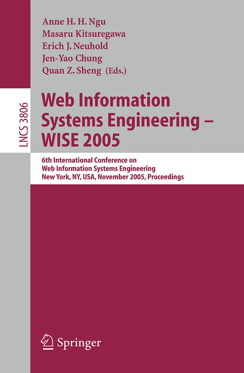 Web Mining.- Mining Communities on the Web Using a Max-Flow and a Site-Oriented Framework.- A Web Recommendation Technique Based on Probabilistic Latent Semantic Analysis.- Constructing Interface Schemas for Search Interfaces of Web Databases.- Web Information Retrieval.- Temporal Ranking of Search Engine Results.- Evaluation of Result Merging Strategies for Metasearch Engines.- Decomposition-Based Optimization of Reload Strategies in the World Wide Web.- Metadata Management.- An Ontological Approach for Defining Agents for Collaborative Applications.- Improving Web Data Annotations with Spreading Activation.- Semantic Partitioning of Web Pages.- Ontology and Semantic Web.- A Formal Ontology Reasoning with Individual Optimization: A Realization of the Semantic Web.- oMAP: Combining Classifiers for Aligning Automatically OWL Ontologies.- Semantic Web Technologies for Interpreting DNA Microarray Analyses: The MEAT System.- XML.- Extracting Global Policies for Efficient Access Control of XML Documents.- Querying and Repairing Inconsistent XML Data.- Towards Automatic Generation of Rules for Incremental Maintenance of XML Views of Relational Data.- Web Service Method.- A Methodological Approach for Incorporating Adaptive Navigation Techniques into Web Applications.- A Web Service Support to Collaborative Process with Semantic Information.- Server-Side Caching Strategies for Online Auction Sites.- Web Service Structure.- Maintaining Consistency Under Isolation Relaxation of Web Services Transactions.- Binding and Execution of Web Service Compositions.- Handling Transactional Properties in Web Service Composition.- Collaborative Methodology.- XFlow: An XML-Based Document-Centric Workflow.- Optimization of XSLT by Compact Specialization and Combination.- Extracting Web Data Using Instance-Based Learning.- P2P, Ubiquitous and Mobile.- PRoBe: Multi-dimensional Range Queries in P2P Networks.- An Infrastructure for Reactive Information Environments.- LoT-RBAC: A Location and Time-Based RBAC Model.- Document Retrieval Applications.- Document Re-ranking by Generality in Bio-medical Information Retrieval.- Representing and Reasoning About Privacy Abstractions.- Conceptual Query Refinement: The Basic Model.- Short Paper Session 1: Web Services and E-Commerce.- Peer-to-Peer Technology Usage in Web Service Discovery and Matchmaking.- A Contract-Based Approach for Monitoring Collaborative Web Services Using Commitments in the Event Calculus.- Asynchronous Web Services Communication Patterns in Business Protocols.- Towards the Automation of E-Negotiation Processes Based on Web Services - A Modeling Approach.- Modeling of User Acceptance of Consumer E-Commerce Website.- Short Paper Session 2: Recommendation and Web Information Extraction.- A Collaborative Recommender System Based on User Association Clusters.- Space-Limited Ranked Query Evaluation Using Adaptive Pruning.- Automated Retraining Methods for Document Classification and Their Parameter Tuning.- NET - A System for Extracting Web Data from Flat and Nested Data Records.- Blog Map of Experiences: Extracting and Geographically Mapping Visitor Experiences from Urban Blogs.- Short Paper Session 3: P2P, Grid and Distributed Management.- Reliable Multicast and Its Probabilistic Model for Job Submission in Peer-to-Peer Grids.- Peer-Sensitive ObjectRank - Valuing Contextual Information in Social Networks.- Automatic Performance Tuning for J2EE Application Server Systems.- Xebu: A Binary Format with Schema-Based Optimizations for XML Data.- Maintaining Versions of Dynamic XML Documents.- Short Paper Session 4: Advanced Issues.- Identifying Value Mappings for Data Integration: An Unsupervised Approach.- Relaxing Result Accuracy for Performance in Publish/Subscribe Systems.- Using Non-random Associations for Predicting Latency in WANs.- An Online Face Recognition System Using Multiple Compressed Images over the Internet.- The Information Market: Its Basic Concepts and Its Challenges.- Poster Flash Session 1.- List Data Extraction in Semi-structured Document.- Optimization Issues for Keyword Search over Tree-Structured Documents.- Semantic Integration of Schema Conforming XML Data Sources.- Extract Salient Words with WordRank for Effective Similarity Search in Text Data.- Intensional P2P Mappings Between RDF Ontologies.- Meta-modeling of Educational Practices for Adaptive Web Based Education Systems.- An On-line Intelligent Recommendation System for Digital Products Using Fuzzy Logic.- Consensus Making on the Semantic Web: Personalization and Community Support.- Dictionary-Based Voting Text Categorization in a Chemistry-Focused Search Engine.- Poster Flash Session 2.- An Approach to Securely Interconnect Geo Web Services.- Automatic Keyword Extraction by Server Log Analysis.- Approximate Intensional Representation of Web Search Results.- A Unique Design for High-Performance Decentralized Resources Locating: A Topological Perspective.- Searching the Web Through User Information Spaces.- REBIEX: Record Boundary Identification and Extraction Through Pattern Mining.- Discovering the Biomedical Deep Web.- A Potential IRI Based Phishing Strategy.- Multiway Iceberg Cubing on Trees.- Industry-1: Semantic Web.- Building a Semantic-Rich Service-Oriented Manufacturing Environment.- Building a Semantic Web System for Scientific Applications: An Engineering Approach.- A SOAP Container Model for e-Business Messaging Requirements.- Industry-2: SOA.- An Empirical Study of Security Threats and Countermeasures in Web Services-Based Services Oriented Architectures.- Collaborative End-Point Service Modulation System (COSMOS).- A Process-Driven e-Business Service Integration System and Its Application to e-Logistics Services.- Industry-3: BPM.- BPM and SOA: Synergies and Challenges.- Web Performance Indicator by Implicit User Feedback - Application and Formal Approach.- Discovering the Most Frequent Patterns of Executions in Business Processes Described in BPEL.- CONFIOUS: Managin