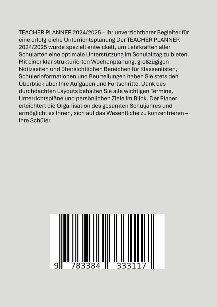 TEACHER PLANNER 2024/2025 Der ideale Planer für Lehrkräfte Der TEACHER PLANNER 2024/2025 bietet Lehrkräften eine umfassende und gut strukturierte Planungshilfe für das gesamte Schuljahr. Mit praktischen Funktionen wie Wochenkalendern, monatlichen Übersichten, ...