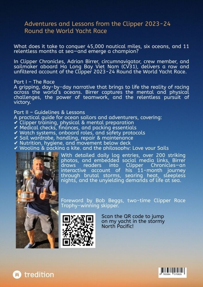 Clipper Chronicles is a compelling firsthand account of the Clipper 2023-24 Round the World Yacht Race, written by crew member and sailmaker Adrian Birrer, who sailed 45,000 nautical miles aboard the winning yacht Ha Long Bay Viet Nam (CV31). Part I - The Race offers a vivid, day-by-day narrative across 331 days at sea, featuring over 200 photographs, route maps, and QR codes linking to onboard video clips. From towering waves to tropical calms, it captures the true intensity of offshore racing. Part II - Guidelines & Lessons provides practical advice on training, preparation, safety, crew life, watch systems, and the philosophy "Love your Sails" - a mindful approach to caring for your gear as your lifeline on the ocean. A must-read for ocean sailors, aspiring adventurers, and anyone curious about the physical, mental, and emotional challenges of circumnavigating the globe. "In this book, I take you with me-out of your comfort zone and onto the open sea. Join me as we race through 14 stages around the world, sailing day and night for weeks on end, in full competition mode. High risk. High responsibility. You'll face intense physical and mental challenges, push beyond your limits, and experience both the raw power of nature and the strength of true teamwork. There are no guarantees-only relentless effort, deep trust, and moments of both frustration and elation. Work hard. Play hard. And somewhere along the way, discover who you truly are." Experience the wonder of close encounters with wildlife. A passage from Clipper Chronicles: "One albatross in particular glides around the boat with majestic ease and uncanny precision. Its wings-stretching nearly three metres-vanish behind a cresting wave, skimming the surface with scarcely an inch to spare beneath its feathers. It hardly ever beats its wings, yet it remains effortlessly aloft. Even at night, it circles us, its silhouette fleeting against the darkness. It's said that albatrosses can sleep while flying, shutting down one hemisphere of the brain at a time. I try to communicate with this silent companion, giving a wave each time as it sweeps close by. My crewmates chuckle at the gesture-but doesn't it tilt its head towards me on that final pass, as if in quiet acknowledgement? Perhaps I imagined it-but the feeling of connection was real."