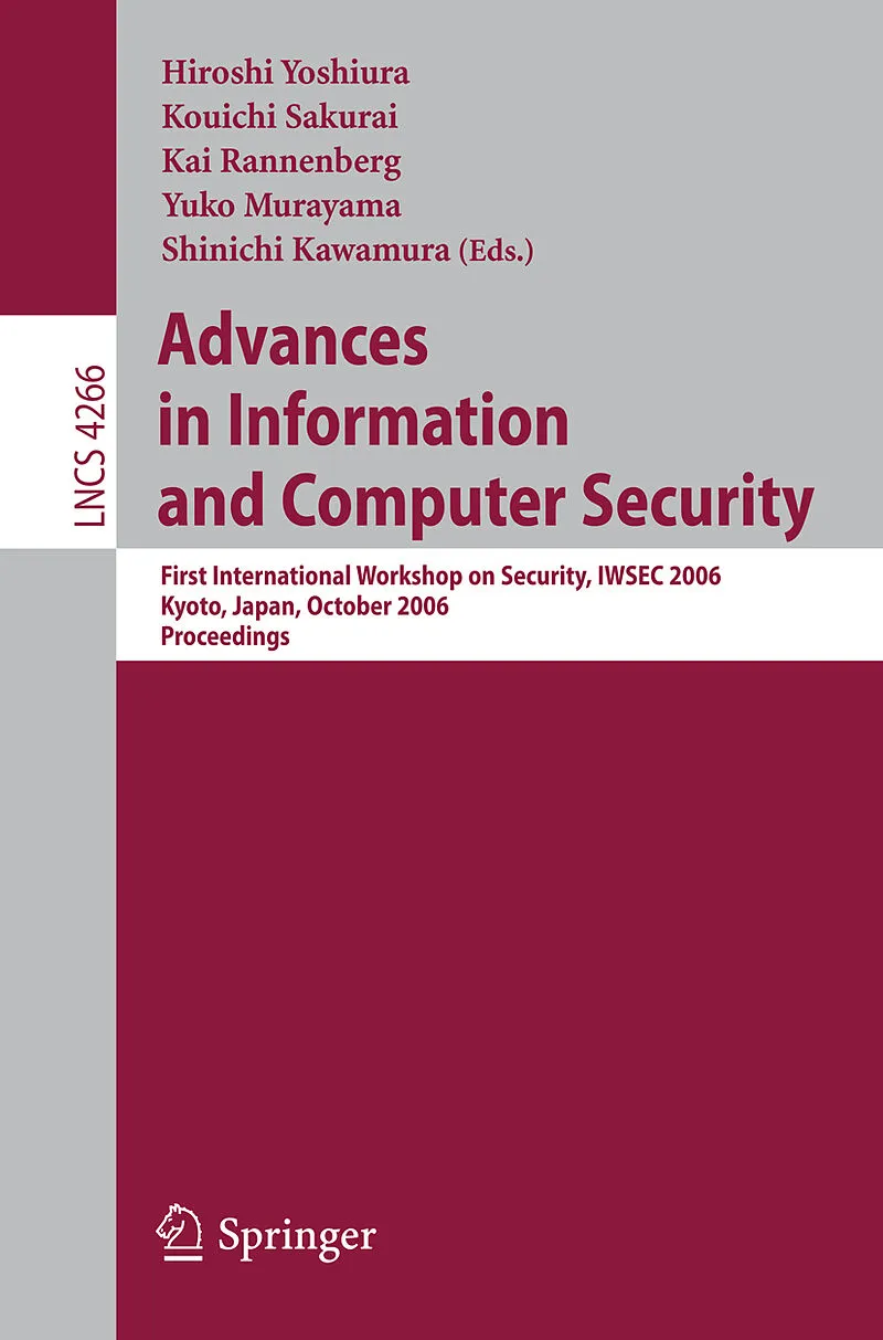 ItwasourpleasuretoholdtheInternationalWorkshoponSecurity2006(IWSEC 2006) this year in Kyoto and to publish the proceedings as a volume of the Lecture Notes in Computer Science series. The workshop was our ?rst trial in that two major academic society groups on...ItwasourpleasuretoholdtheInternationalWorkshoponSecurity2006(IWSEC 2006) this year in Kyoto and to publish the proceedings as a volume of the Lecture Notes in Computer Science series. The workshop was our ?rst trial in that two major academic society groups on security in Japan, viz. ISEC and CSEC, jointly organized it; ISEC is a te- nical group on information security of the Institute of Electronics, Information and Communication Engineers (IEICE), and CSEC is a special interest group on computer security of the Information Processing Society of Japan (IPSJ). It was Ryoichi Sasaki, the former head of CSEC, who proposed holding such an international workshop in Japan for the ?rst time, two years ago. The two groups supported his idea and started organizing the workshop. CSEC has its annual domestic symposium, the Computer Security Symposium (CSS), in - tober for three days, and we decided to organize the workshop prior to CSS this year. The initial aim of the workshop was primarily to provide young researchers with the opportunity to present their work in English. However, due to more submissions than we had anticipated, the quality of the accepted papers became far better than we had expected. Theconferencereceived147submissions,outofwhichtheprogramcommittee selected 30 for presentation. These proceedings contain the ?nal versions of the accepted papers, which the authors ?nalized on the basis of comments from the reviewers. Since these revisions were not subject to editorial review, the authors bear full responsibility for the contents of their papers.