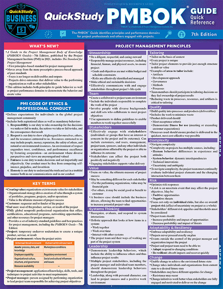 6 page laminated guide includes: PMI Code of Ethics & Professional Conduct Key Terms Project Management Principles