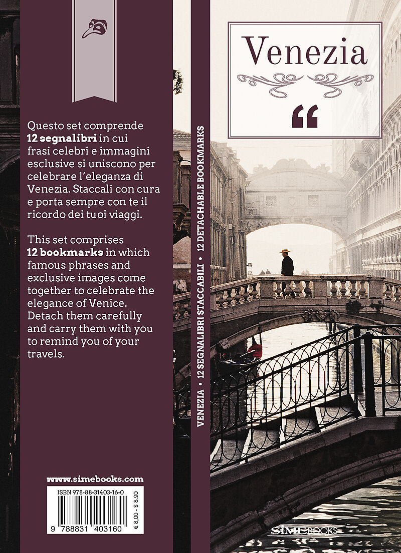 Dieses Set beinhaltet 12 Lesezeichen, auf denen bekannte Zitate und atemberaubende Fotos die Eleganz Venedigs zelebrieren. Lösen Sie diese vorsichtig ab und tragen Sie diese als Andenken oder Inspiration immer bei sich. Themen: Bridge of Sighs - Punta della Do...