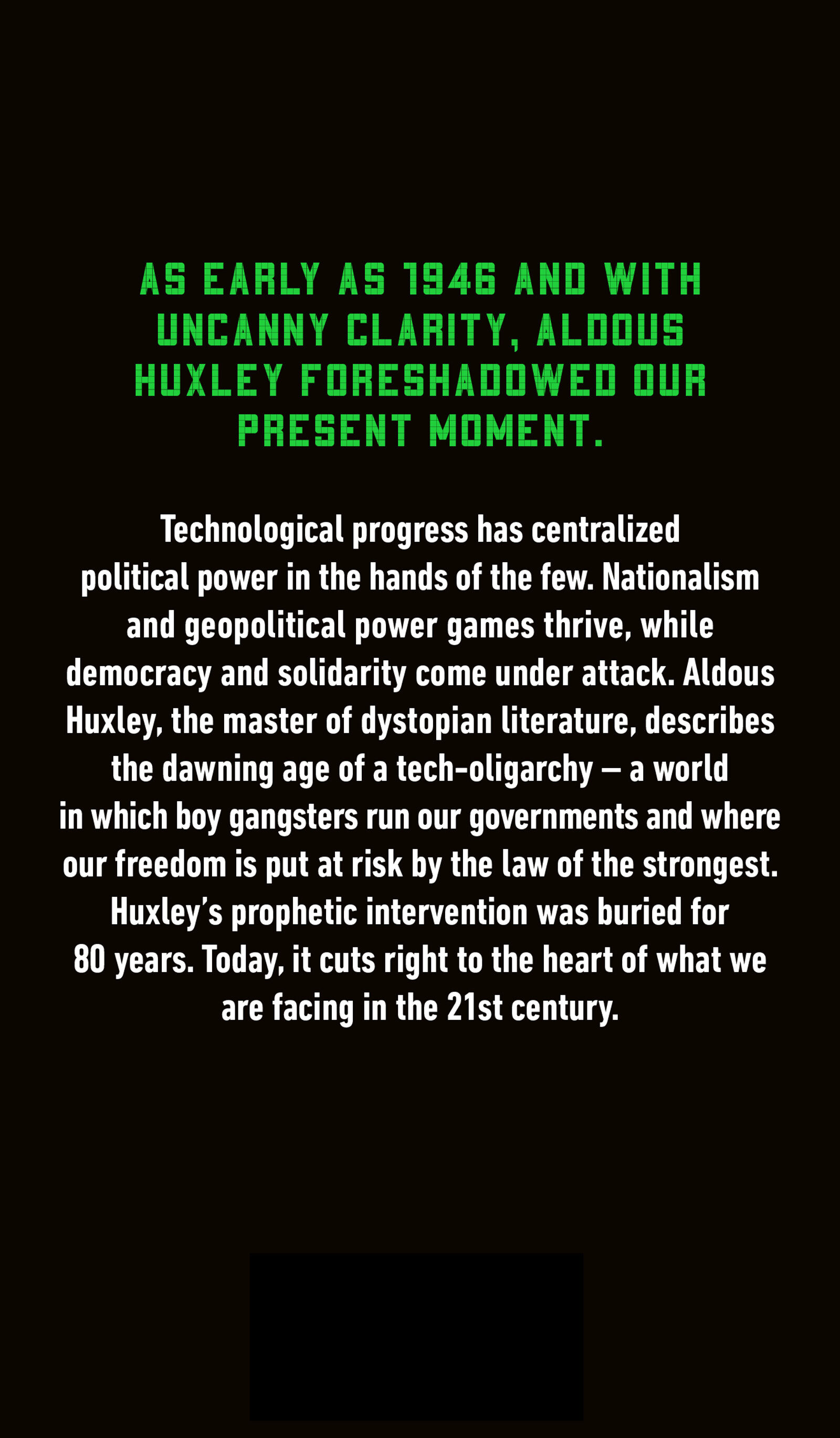 The prophetical essay about tech oligarchs, power, and boy gangsters by the author of »Brave New World« »Forget Orwell, read Huxley!« Philipp Blom As early as 1946 and with uncanny clarity, Aldous Huxley foreshadowed our present moment where technological prog...