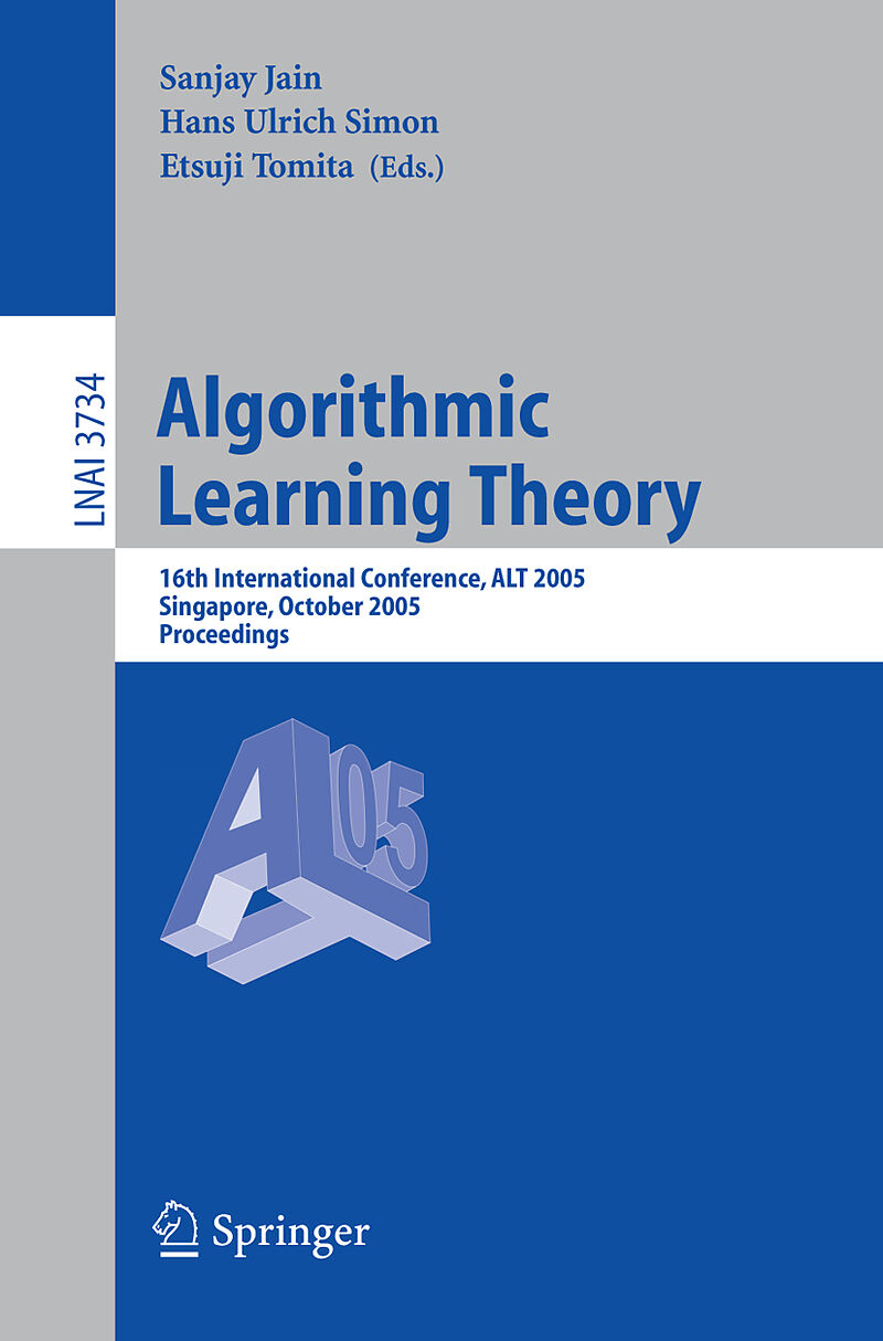 This volume contains the papers presented at the 16th Annual International Conference on Algorithmic Learning Theory (ALT 2005), which was held in S- gapore (Republic of Singapore), October 8 11, 2005. The main objective of the conference is to provide an inte...This volume contains the papers presented at the 16th Annual International Conference on Algorithmic Learning Theory (ALT 2005), which was held in S- gapore (Republic of Singapore), October 8 11, 2005. The main objective of the conference is to provide an interdisciplinary forum for the discussion of the t- oretical foundations of machine learning as well as their relevance to practical applications. The conference was co-located with the 8th International Conf- enceonDiscoveryScience(DS2005). Theconferencewasalsoheldinconjunction with the centennial celebrations of the National University of Singapore. The volume includes 30 technical contributions, which were selected by the program committee from 98 submissions. It also contains the ALT 2005 invited talks presented by Chih-Jen Lin (National Taiwan University, Taipei, Taiwan) on Training Support Vector Machines via SMO-type Decomposition Methods, and by Vasant Honavar (Iowa State University, Ames, Iowa, USA) on Al- rithmsandSoftwareforCollaborativeDiscoveryfromAutonomous,Semantically Heterogeneous, Distributed, Information Sources. Furthermore, this volume - cludes an abstract of the joint invited talk with DS 2005 presented by Gary L. Bradshaw (Mississippi State University, Starkville, USA) on Invention and Arti?cial Intelligence, and abstracts of the invited talks for DS 2005 presented by Ross D. King (The University of Wales, Aberystwyth, UK) on The Robot Scientist Project, and by Neil Smalheiser (University of Illinois at Chicago, Chicago, USA) on The Arrowsmith Project: 2005 Status Report. The c- plete versions of these papers are published in the DS 2005 proceedings (Lecture Notes in Computer Science Vol. 3735).