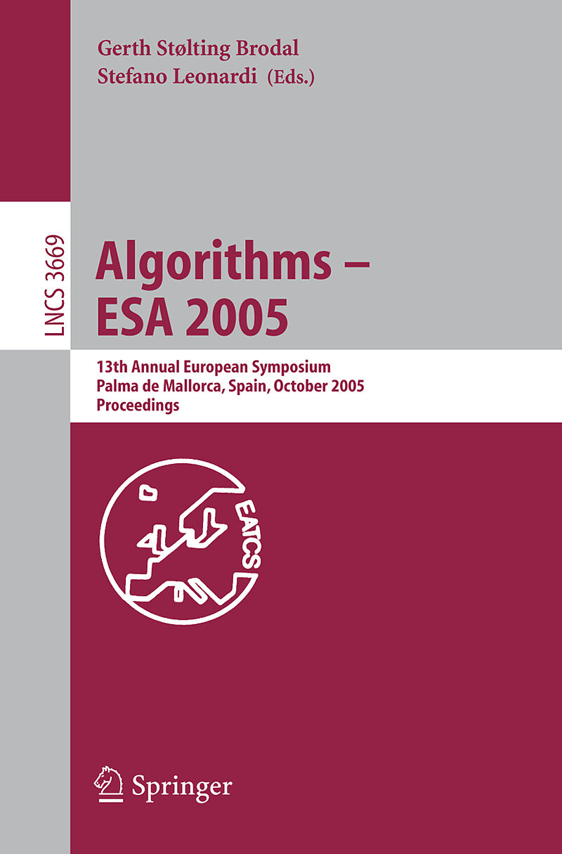 Designing Reliable Algorithms in Unreliable Memories.- From Balanced Graph Partitioning to Balanced Metric Labeling.- Fearful Symmetries: Quantum Computing, Factoring, and Graph Isomorphism.- Exploring an Unknown Graph Efficiently.- Online Routing in Faulty Meshes with Sub-linear Comparative Time and Traffic Ratio.- Heuristic Improvements for Computing Maximum Multicommodity Flow and Minimum Multicut.- Relax-and-Cut for Capacitated Network Design.- On the Price of Anarchy and Stability of Correlated Equilibria of Linear Congestion Games,,.- The Complexity of Games on Highly Regular Graphs.- Computing Equilibrium Prices: Does Theory Meet Practice?.- Efficient Exact Algorithms on Planar Graphs: Exploiting Sphere Cut Branch Decompositions.- An Algorithm for the SAT Problem for Formulae of Linear Length.- Linear-Time Enumeration of Isolated Cliques.- Finding Shortest Non-separating and Non-contractible Cycles for Topologically Embedded Graphs.- Delineating Boundaries for Imprecise Regions.- Exacus: Efficient and Exact Algorithms for Curves and Surfaces.- Min Sum Clustering with Penalties.- Improved Approximation Algorithms for Metric Max TSP.- Unbalanced Graph Cuts.- Low Degree Connectivity in Ad-Hoc Networks.- 5-Regular Graphs are 3-Colorable with Positive Probability.- Optimal Integer Alphabetic Trees in Linear Time.- Predecessor Queries in Constant Time?.- An Algorithm for Node-Capacitated Ring Routing.- On Degree Constrained Shortest Paths.- A New Template for Solving p-Median Problems for Trees in Sub-quadratic Time.- Roll Cutting in the Curtain Industry.- Space Efficient Algorithms for the Burrows-Wheeler Backtransformation.- Cache-Oblivious Comparison-Based Algorithms on Multisets.- Oblivious vs. Distribution-Based Sorting: An Experimental Evaluation.- Allocating Memory in a Lock-Free Manner.- Generating Realistic Terrains with Higher-Order Delaunay Triangulations.- I/O-Efficient Construction of Constrained Delaunay Triangulations.- Convex Hull and Voronoi Diagram of Additively Weighted Points.- New Tools and Simpler Algorithms for Branchwidth.- Treewidth Lower Bounds with Brambles.- Minimal Interval Completions.- A 2-Approximation Algorithm for Sorting by Prefix Reversals.- Approximating the 2-Interval Pattern Problem.- A Loopless Gray Code for Minimal Signed-Binary Representations.- Efficient Approximation Schemes for Geometric Problems?.- Geometric Clustering to Minimize the Sum of Cluster Sizes.- Approximation Schemes for Minimum 2-Connected Spanning Subgraphs in Weighted Planar Graphs.- Packet Routing and Information Gathering in Lines, Rings and Trees.- Jitter Regulation for Multiple Streams.- Efficient c-Oriented Range Searching with DOP-Trees.- Matching Point Sets with Respect to the Earth Mover's Distance.- Small Stretch Spanners on Dynamic Graphs.- An Experimental Study of Algorithms for Fully Dynamic Transitive Closure.- Experimental Study of Geometric t-Spanners.- Highway Hierarchies Hasten Exact Shortest Path Queries.- Preemptive Scheduling of Independent Jobs on Identical Parallel Machines Subject to Migration Delays.- Fairness-Free Periodic Scheduling with Vacations.- Online Bin Packing with Cardinality Constraints.- Fast Monotone 3-Approximation Algorithm for Scheduling Related Machines.- Engineering Planar Separator Algorithms.- Stxxl: Standard Template Library for XXL Data Sets.- Negative Cycle Detection Problem.- An Optimal Algorithm for Querying Priced Information: Monotone Boolean Functions and Game Trees.- Online View Maintenance Under a Response-Time Constraint.- Online Primal-Dual Algorithms for Coveringand Packing Problems.- Efficient Algorithms for Shared Backup Allocation in Networks with Partial Information.- Using Fractional Primal-Dual to Schedule Split Intervals with Demands.- An Approximation Algorithm for the Minimum Latency Set Cover Problem.- Workload-Optimal Histograms on Streams.- Finding Frequent Patterns in a String in Sublinear Time.- Online Occlusion Culling.- Shortest Paths in Matrix Multiplication Time.- Computing Common Intervals of K Permutations, with Applications to Modular Decomposition of Graphs.- Greedy Routing in Tree-Decomposed Graphs.- Making Chord Robust to Byzantine Attacks.- Bucket Game with Applications to Set Multicover and Dynamic Page Migration.- Bootstrapping a Hop-Optimal Network in the Weak Sensor Model.- Approximating Integer Quadratic Programs and MAXCUT in Subdense Graphs.- A Cutting Planes Algorithm Based Upon a Semidefinite Relaxation for the Quadratic Assignment Problem.- Approximation Complexity of min-max (Regret) Versions of Shortest Path, Spanning Tree, and Knapsack.- Robust Approximate Zeros.- Optimizing a 2D Function Satisfying Unimodality Properties.