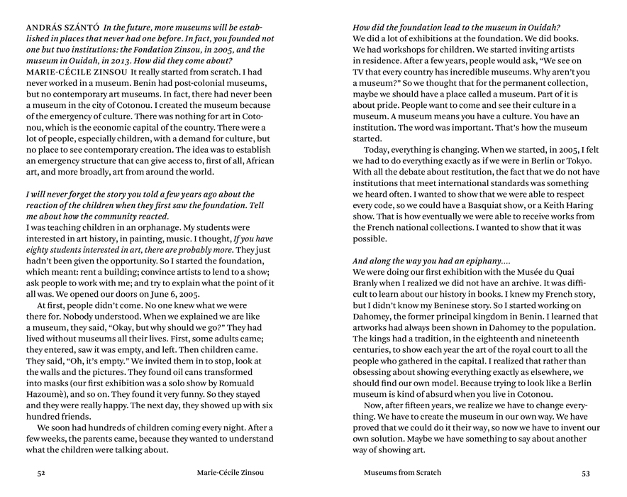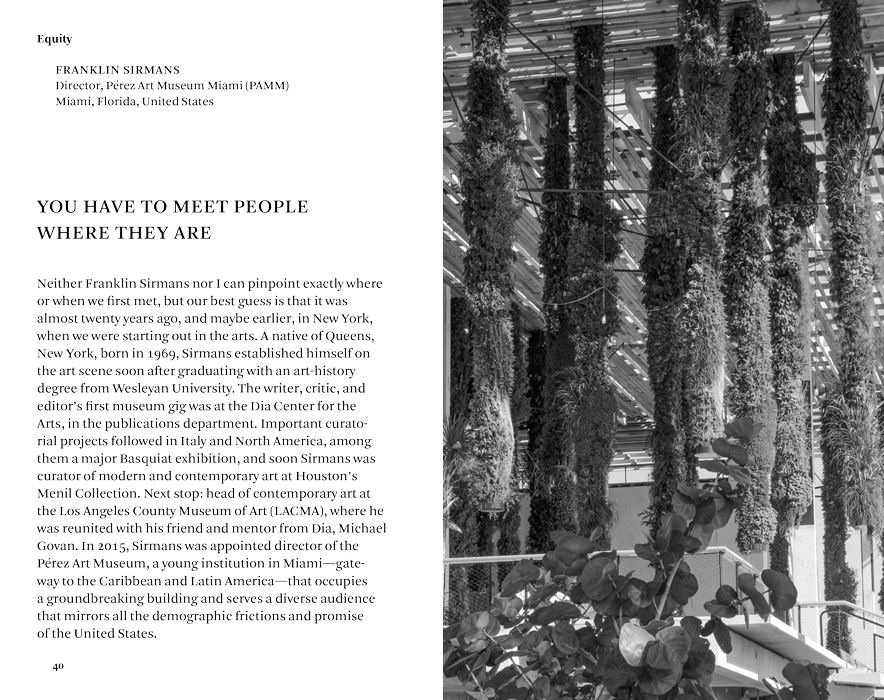 CONVERSATION PARTNERS: Marion Ackermann (Staatliche Kunstsammlungen Dresden), Cecilia Alemani (The High Line, New York), Anton Belov (Garage Museum of Contemporary Art, Moscow), Meriem Berrada (MACAAL, Marrakesh), Daniel Birnbaum (Acute Art, London), Thomas P. Campbell (Fine Arts Museums of San Francisco), Tania Coen-Uzzielli (Tel Aviv Museum of Art), Rhana Devenport (Art Gallery of South Australia, Adelaide), María Mercedes González (Museo de Arte Moderno de Medellín), Max Hollein (The Metropolitan Museum of Art, New York), Sandra Jackson-Dumont (Lucas Museum of Narrative Art, Los Angeles), Mami Kataoka (Mori Art Museum, Tokyo), Brian Kennedy (Peabody Essex Museum, Salem), Koyo Kouoh (Zeitz Museum of Contemporary Art Africa, Cape Town), Sonia Lawson (Palais de Lomé), Adam Levine (Toledo Museum of Art), Victoria Noorthoorn (Museo de Arte Moderno de Buenos Aires), Hans Ulrich Obrist (Serpentine Galleries, London), Anne Pasternak (Brooklyn Museum), Adriano Pedrosa (MASP, São Paulo), Suhanya Raffel (M+ Museum, Hong Kong), Axel Ruger (Royal Academy of Arts, London), Katrina Sedgwick (Australian Center for the Moving Image, Melbourne), Franklin Sirmans (Pérez Art Museum Miami), Eugene Tan (National Gallery Singapore & Singapore Art Museum), Philip Tinari (UCCA Center for Contemporary Art, Beijing), Marc-Olivier Wahler (Musée d'Art et d'Histoire, Geneva), and Marie-Cécile Zinsou (Musée de la Fondation Zinsou, Ouidah)