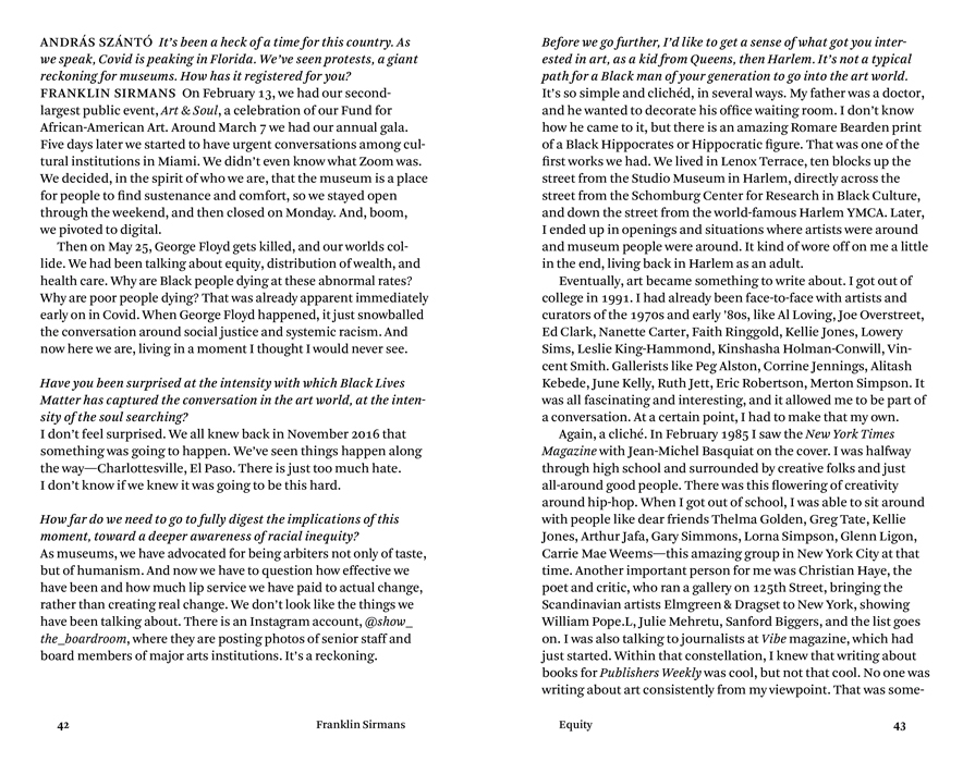 ANDRÁS SZÁNTÓ (*1964, Budapest), PhD, advises museums, cultural institutions, and leading brands on cultural strategy. An author and editor, his writings have appeared in the New York Times, Artforum, the Art Newspaper, and many other publications. He has overseen the National Arts Journalism Program at Columbia University and the Global Museum Leaders Colloquium at the Metropolitan Museum of Art. Szántó, who lives in Brooklyn, has been conducting conversations with art-world leaders since the early 1990s, including as a frequent moderator of the Art Basel Conversations series.