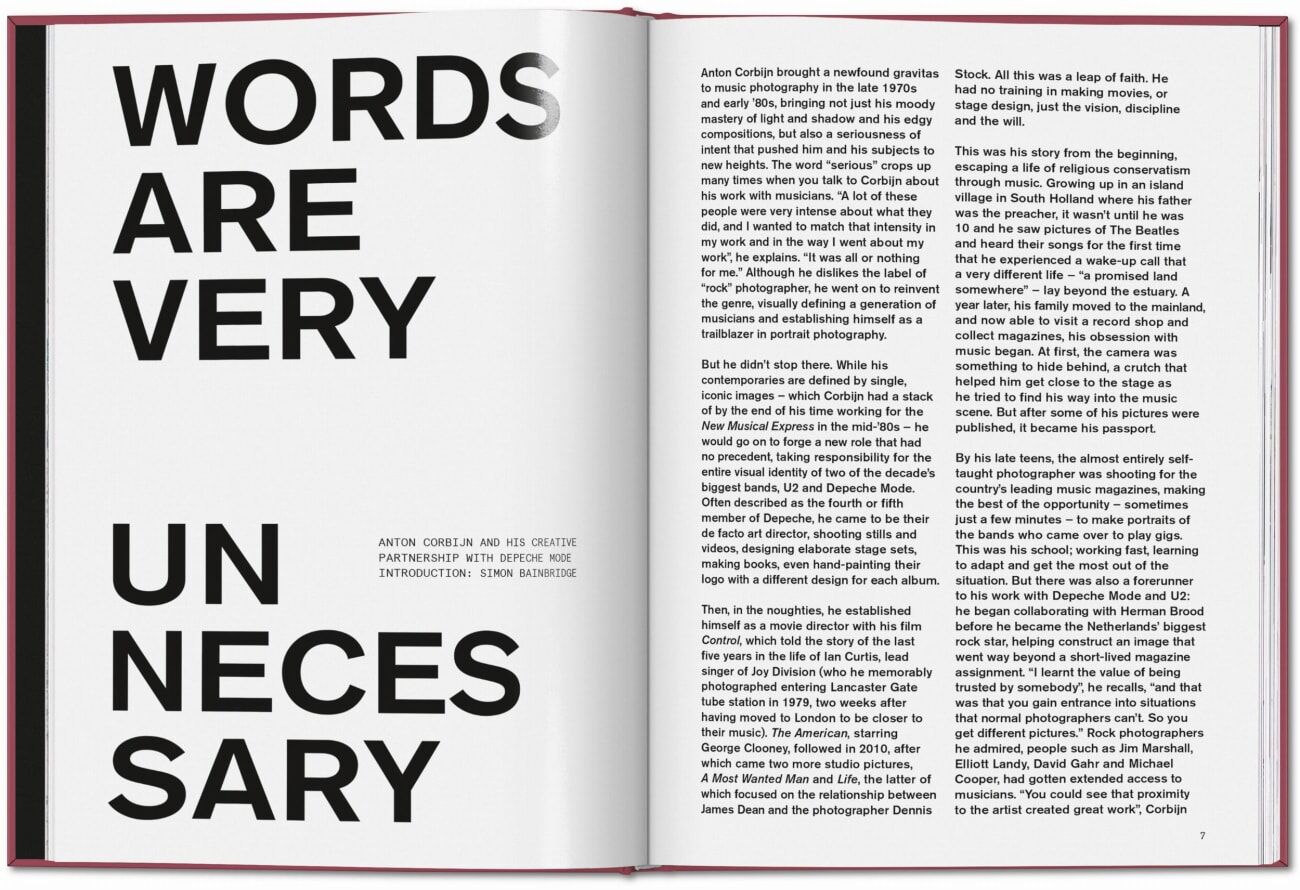 Entstanden in enger Zusammenarbeit mit der Band gewährt Depeche Mode by Anton Corbijn eine Vielzahl von Einblicken in die Arbeit mit Corbijn und zeigt auf eindrucksvolle Weise, wie die einzigartige Ästhetik eines Mannes, von dem sämtliche Fotografien, die meisten Musikvideos, Albumcover und Setdesigns stammen, die anhaltende Popularität der Band prägten. In der Einleitung erinnert sich Corbijn an seine vielschichtige Rolle bei Depeche Mode: Vieles hing von mir ab. Ich wollte einfach der Richtige für sie sein, für sie mitdenken und aus mir das Allerbeste herausholen. Der Band zeugt von der Tiefe und Breite dieser Großartigkeit und feiert eine der kreativsten und beständigsten Kooperationen der Musikgeschichte.