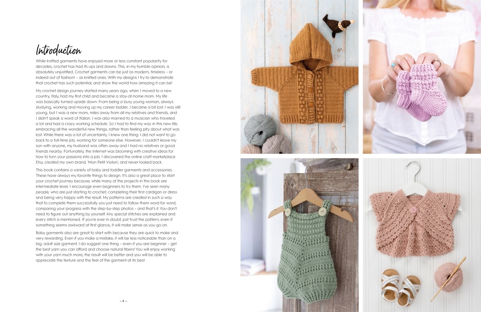While knitted garments have enjoyed more or less constant popularity for decades, crochet has had its ups and downs. This, in my humble opinion, is absolutely unjustified. Crochet garments can be just as modern, timeless - or indeed out of fashion! - as knitted ones. With my designs I try to demonstrate that crochet has such potential, and show the world how amazing it can be!My crochet design journey started many years ago, when I moved to a new country, Italy, had my first child and became a stay-at-home mom. My life was basically turned upside down. From being a busy young woman, always studying, working and moving up my career ladder, I became a bit lost. I was still young, but I was a new mom, miles away from all my relatives and friends, and I didn't speak a word of Italian. I was also married to a musician who traveled a lot and had a crazy working schedule. So I had to find my way in this new life, embracing all the wonderful new things, rather than feeling pity about what was lost. While there was a lot of uncertainty, I knew one thing: I did not want to go back to a full-time job, working for someone else. However, I couldn't leave my son with anyone, my husband was often away and I had no relatives or good friends nearby. Fortunately, the Internet was blooming with creative ideas for how to turn your passions into a job. I discovered the online craft marketplace Etsy, created my own brand, 'Mon Petit Violon', and never looked back.This book contains a variety of baby and toddler garments and accessories. These have always my favorite things to design. It's also a great place to start your crochet journey because, while many of the projects in this book are intermediate level, I encourage even beginners to try them. I've seen many people, who are just starting to crochet, completing their first cardigan or dress and being very happy with the result. My patterns are created in such a way that to complete them successfully you just need to follow them word for word, comparing your progress with the step-by-step photos - and that's it. You don't need to figure out anything by yourself. Any special stitches are explained and every stitch is mentioned. If you're ever in doubt, just trust the pattern; even if something seems awkward at first glance, it will make sense as you go on.Baby garments also are great to start with because they are quick to make and very rewarding. Even if you make a mistake, it will be less noticeable than on a big, adult size garment. I do suggest one thing - even if you are beginner - get the best yarn you can afford and choose natural fibers! You will enjoy working with your yarn much more, the result will be better and you will be able to appreciate the texture and the feel of the garment at its best.