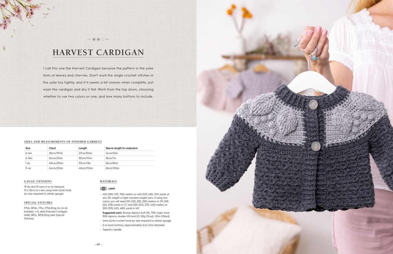 Features garments for all genders in a dreamy colour palette with exciting stitch patterns that crocheters love, written in US crochet terms. Crochet an heirloom layette with this exquisite collection of 20 patterns. Adorable colours, rich textures, beautiful ...Features garments for all genders in a dreamy colour palette with exciting stitch patterns that crocheters love, written in US crochet terms. Crochet an heirloom layette with this exquisite collection of 20 patterns. Adorable colours, rich textures, beautiful ruffles, and delicate motifs combine to create a gorgeous wardrobe and accessories for babies, including rompers, dresses, sweaters, cardigans, and shrugs and an heirloom cot blanket, all made with interesting stitch patterns.