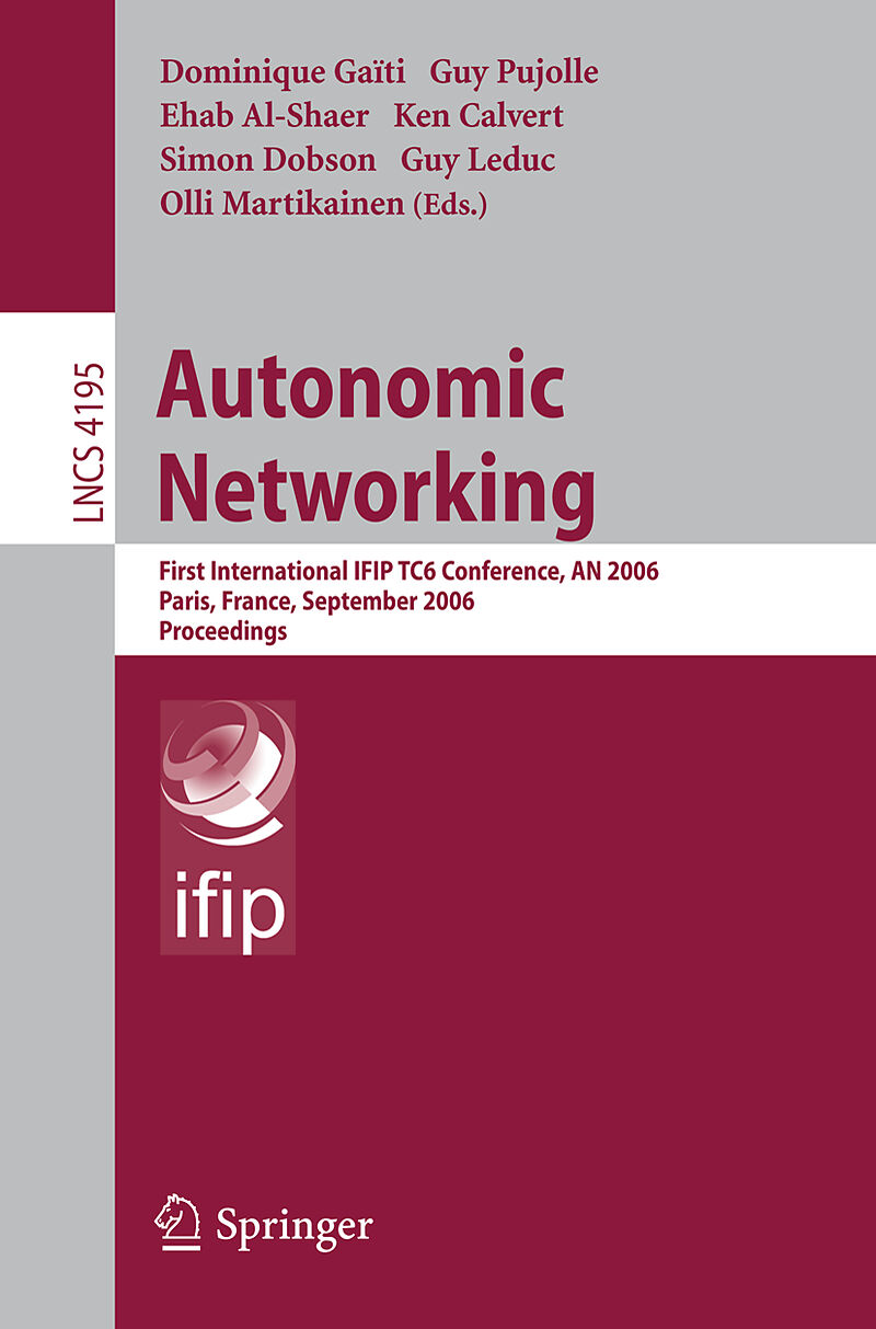 AN'06.- Towards Autonomic Networks.- A Cognitive Architecture for Personal Networks.- A Cross-Layer Architecture for Autonomic Communications.- Self-configuration of Network Devices with Configuration Logic.- Dynamic Decision Making for Candidate Access Point Selection.- A Multi Agent System Approach for Self Resource Regulation in IP Networks.- DoS Protection for a Pragmatic Multiservice Network Based on Programmable Networks.- Lessons for Autonomic Services from the Design of an Anonymous DoS Protection Overlay.- An Extensible and Flexible System for Network Anomaly Detection.- Design and Implementation of a Service Provisioning Platform Using Smart Cards.- Autonomous Agents for Self-managed MPLS DiffServ-TE Domain.- An Efficient Dynamic Bandwidth Allocation Algorithm for Quality of Service Networks.- Artificial Intelligence Techniques in the Dynamic Negotiation of QoS: A User Interface for the Internet New Generation.- An Approach to Integrated Semantic Service Discovery.- Policy-Based Management and Context Modelling Contributions for Supporting Services in Autonomic Systems.- Implicit Context-Sensitive Mobile Computing Using Semantic Policies.- GXLA a Language for the Specification of Service Level Agreements.- A Service Management Approach for Self-healing Wireless Sensor Networks.- Integration of Mobile IPv6 into Mobile Ad-Hoc Network Systems.- AToM: Atomic Topology Management of Wireless Sensor Networks.- An Architecture for Autonomic Management of Ambient Networks.- Autonomic Communications: Exploiting Advanced and Game Theoretical Techniques for RAT Selection and Protocol Reconfiguration.- Managing Policies for Dynamic Spectrum Access.- An Intermediate Framework for Unifying and Automating Mobile Communication Systems.