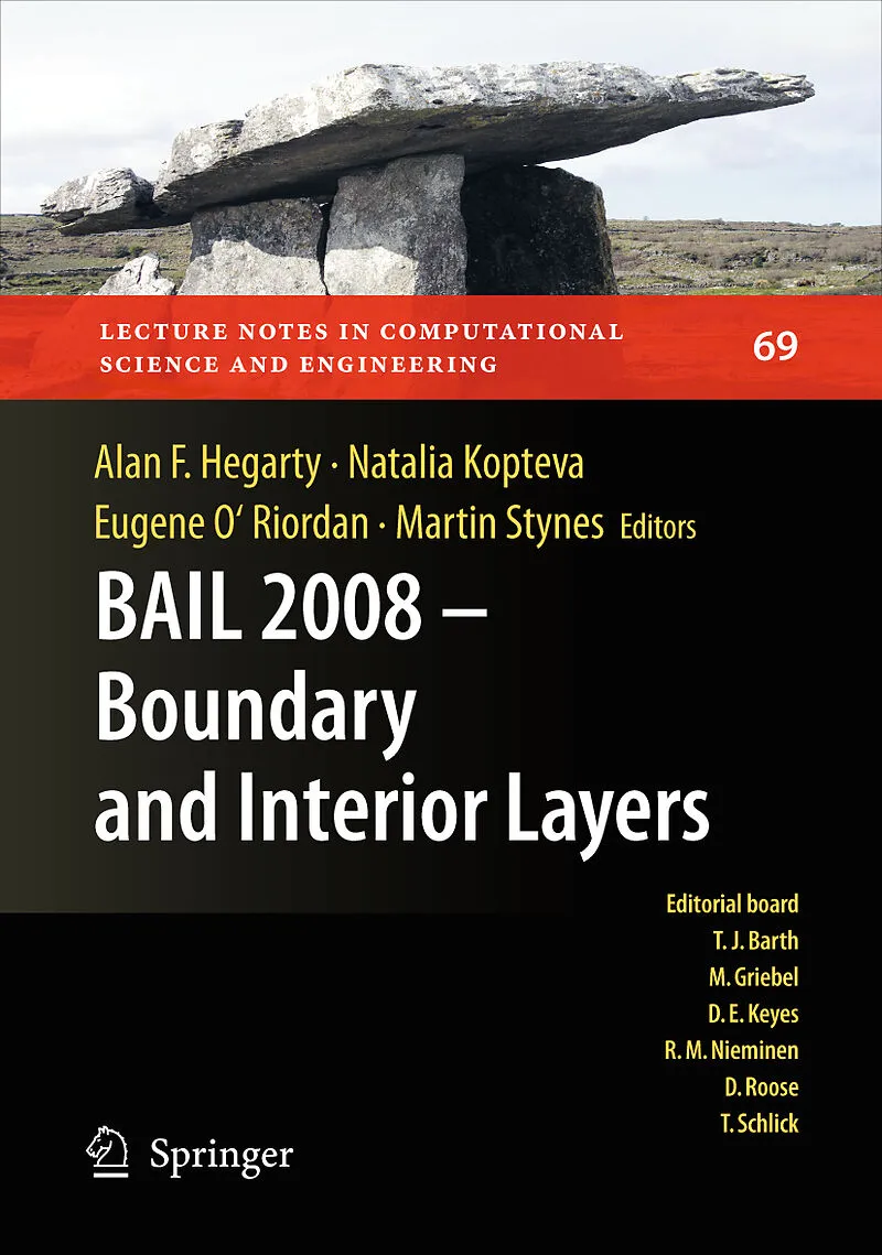 These Proceedings contain a selection of the lectures given at the conference BAIL 2008: Boundary and Interior Layers Computational and Asymptotic Methods, which was held from 28th July to 1st August 2008 at the University of Limerick, Ireland. The ?rst three ...These Proceedings contain a selection of the lectures given at the conference BAIL 2008: Boundary and Interior Layers Computational and Asymptotic Methods, which was held from 28th July to 1st August 2008 at the University of Limerick, Ireland. The ?rst three BAIL conferences (1980, 1982, 1984) were organised by Professor John Miller in Trinity College Dublin, Ireland. The next seven were held in Novosibirsk (1986), Shanghai (1988), Colorado (1992), Beijing (1994), Perth (2002),Toulouse(2004),and Got ¨ tingen(2006).With BAIL 2008the series returned to Ireland. BAIL 2010 is planned for Zaragoza. The BAIL conferences strive to bring together mathematicians and engineers whose research involves layer phenomena,as these two groups often pursue largely independent paths. BAIL 2008, at which both communities were well represented, succeeded in this regard. The lectures given were evenly divided between app- cations and theory, exposing all conference participants to a broad spectrum of research into problems exhibiting solutions with layers. The Proceedings give a good overview of current research into the theory, app- cation and solution (by both numerical and asymptotic methods) of problems that involve boundaryand interior layers. In addition to invited and contributed lectures, the conference included four mini-symposia devoted to stabilized ?nite element methods, asymptotic scaling of wall-bounded ?ows, systems of singularly p- turbed differential equations, and problems with industrial applications (supported by MACSI, the Mathematics Applications Consortium for Science and Industry). These titles exemplify the mix of interests among the participants.