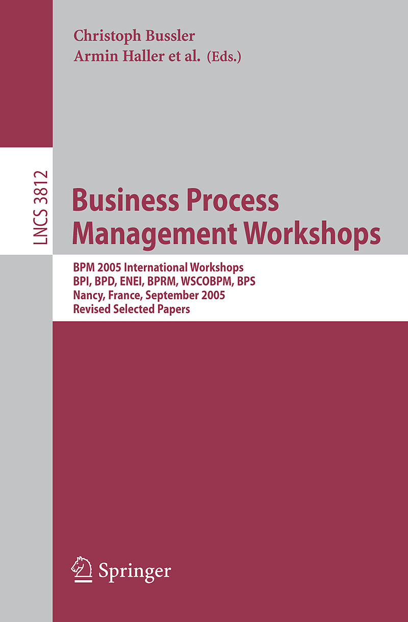 Workshop on Business Processes and Services.- Preface (BPS 2005).- Guided Interaction: A Language and Method for Incremental Revelation of Software Interfaces for Ad Hoc Interaction.- Towards P2P-Based Semantic Web Service Discovery with QoS Support.- Global and Local QoS Guarantee in Web Service Selection.- Web Service Discovery and Dynamic Invocation Based on UDDI/OWL-S.- Workshop on Web Service Choreography and Orchestration for Business Process Management.- Preface (WSCOBPM 2005).- Standards for Web Service Choreography and Orchestration: Status and Perspectives.- From Collaboration Models to BPEL Processes Through Service Models.- A Framework for Automated Negotiation of Service Level Agreements in Services Grids.- A Constrained Object Model for Configuration Based Workflow Composition.- A High-Level Specification for Mediators(Virtual Providers).- WSMX Process Mediation Based on Choreographies.- An Abstract Machine Architecture for Web Service Based Business Process Management.- Workshop on Business Process Intelligence.- Preface (BPI 2005).- Conformance Testing: Measuring the Fit and Appropriateness of Event Logs and Process Models.- Mining Staff Assignment Rules from Event-Based Data.- Towards a Framework for the Agile Mining of Business Processes.- Genetic Process Mining: A Basic Approach and Its Challenges.- On Web Services Workflow Mining.- Preface (ENEI 2005).- Exchange of Business Process Models Using the POP* Meta-model.- UEML 1.0 and UEML 2.0: Benefits, Problems and Comparison.- Facilitating Interoperability: A Cross-Analysis of the Language UEML and the Standard ISO/DIS 19440.- Inter-agent Communications During the Virtual Enterprise Creation.- Applying Enterprise Models to Design Cooperative Scientific Environments.- Architecture-Based InteroperabilityEvaluation in Evolutions of Networked Enterprises.- Enabling Interoperability of Networked Enterprises Through an Integrative Information System Architecture for CRM and SCM.- Interoperability in Service-Based Communities.- CoSeRT: A Framework for Composing Service-Based Real-Time Applications.- Supporting Business Experts in the Design of B2B Transactions Through Interactive Process Simulation.- Requirements to Improve the Synchronisation of Inter-enterprise Models.- On Automating Networked Enterprise Management.- A Methodology for Process Evaluation and Activity Based Costing in Health Care Supply Chain.- Web Services Experiment Using TravelXML: Standard XML for Electronic Commerce in the Travel Industry.- Data Level Enterprise Applications Integration.- Preface (BPD 2005).- Design Processes for Sustainable Performances: A Model and a Method.- Designing Business Process Variants Using the BAT Framework as a Pragmatic Lens.- BPR Implementation: A Decision-Making Strategy.- Applying Specialization to Petri Nets: Implications for Workflow Design.- Intelligent Tools for Workflow Process Redesign: A Research Agenda.- Risk Management in the BPM Lifecycle.- Preface (BPRM 2005).- Business Process Reference Models: Survey and Classification.- Understanding the Term Reference Model in Information Systems Research: History, Literature Analysis and Explanation.- On the Syntax of Reference Model Configuration Transforming the C-EPC into Lawful EPC Models.- Configurable Process Models as a Basis for Reference Modeling.