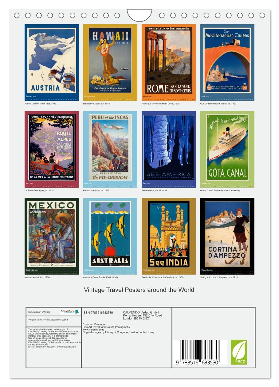 Imagine the time 80 or 100 years ago when travelling was exclusive and sometimes an adventure. The advertising for travel destinations in these times were created by great artist and designers. The Calendar features vintage travel posters from various destinat...
