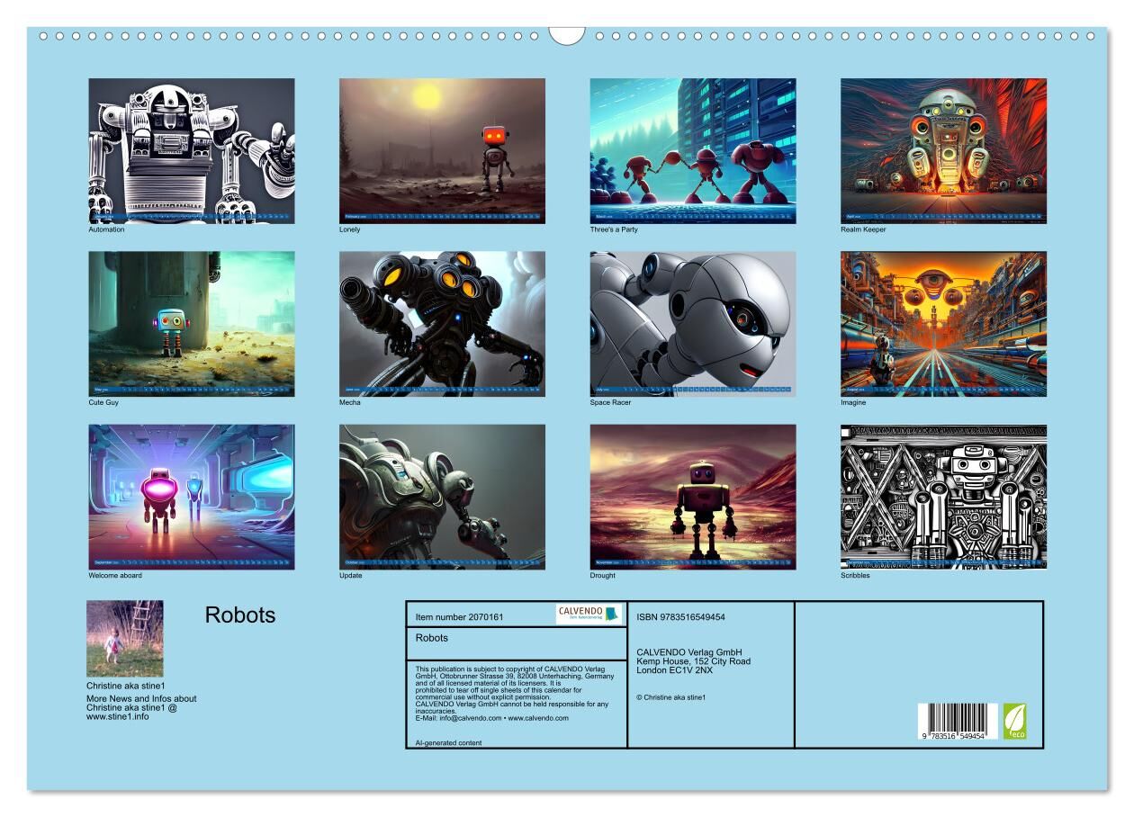 Discover a unique vision of robots imagined by an artificial intelligence in this stunning wall calendar by artist Christine aka stine1. Through the use of digital art and machine learning algorithms, Christine has created 13 mostly colorful images that showca...