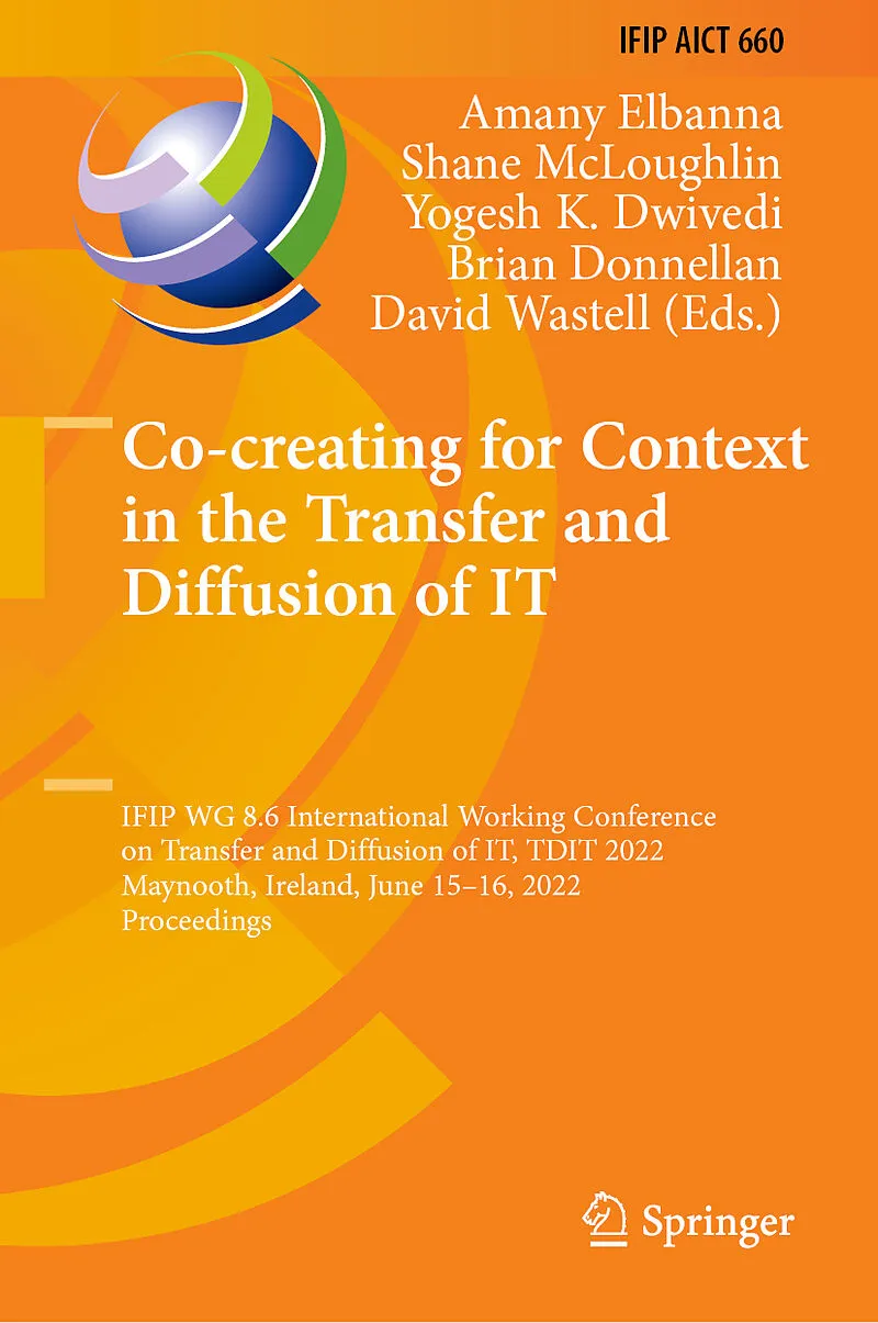 This volume, IFIP AICT 660, constitutes the refereed proceedings of the IFIP WG 8.6 International Working Conference "Co-creating for Context in Prospective Transfer and Diffusion of IT" on Transfer and Diffusion of IT, TDIT 2022, held in Maynooth, Ireland, du...