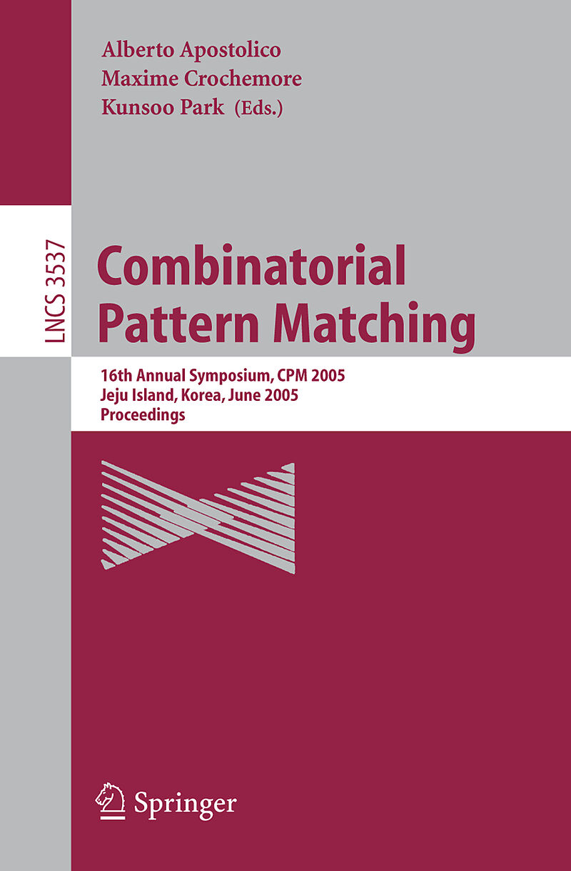 The 16th Annual Symposium on Combinatorial Pattern Matching was held on Jeju Island, Korea on June 19 22, 2005. Previous meetings were held in Paris, London, Tucson, Padova, Asilomar, Helsinki, Laguna Beach, Aarhus, Piscataway,Warwick,Montreal,Jerusalem,Fukuok...The 16th Annual Symposium on Combinatorial Pattern Matching was held on Jeju Island, Korea on June 19 22, 2005. Previous meetings were held in Paris, London, Tucson, Padova, Asilomar, Helsinki, Laguna Beach, Aarhus, Piscataway,Warwick,Montreal,Jerusalem,Fukuoka, Morelia,and Istanbul over the years 1990 2004. In response to the call for papers, CPM 2005 received a record number of 129papers.Eachsubmissionwasreviewedbyatleast threeProgramCommittee members with the assistance of external referees. Since there were many hi- quality papers, the Program Committee s task was extremely di?cult. Through an extensive discussion the Program Committee accepted 37 of the submissions tobepresentedattheconference.Theyconstituteoriginalresearchcontributions in combinatorial pattern matching and its applications. Inadditiontotheselectedpapers,CPM2005hadthreeinvitedpresentations, by Esko Ukkonen from the University of Helsinki, Ming Li from the University of Waterloo, and Naftali Tishby from The Hebrew University of Jerusalem. We would like to thank all Program Committee members and external r- erees for their excellent work, especially given the demanding time constraints; they gave the conference its distinctive character. We also thank all who s- mitted papers for consideration; they all contributed to the high quality of the conference. Finally, we thank the Organizing Committee members and the graduates- dents who worked hard to put in place the logistical arrangements of the c- ference. It is their dedicated contribution that made the conference possible and enjoyable.