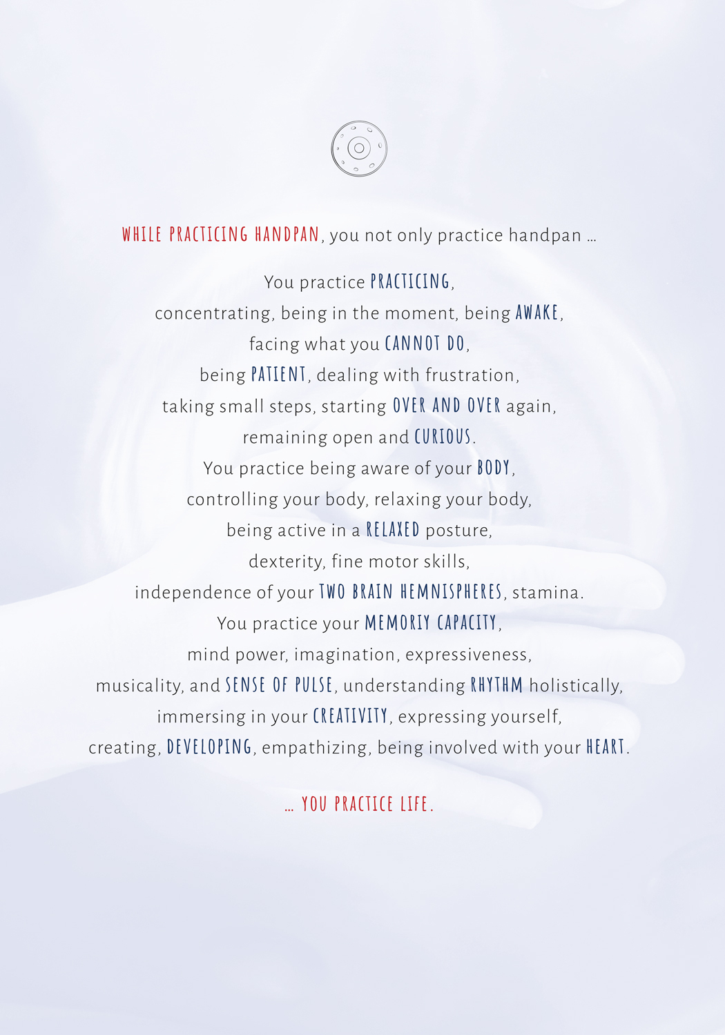 For beginners and advanced students For music amateurs and professionals For right-handed, let-handed, and ambidextrous players For visual, auditory, and kinesthetic learner types Applicable for all handpans and any number of tones Transferable to instruments ...