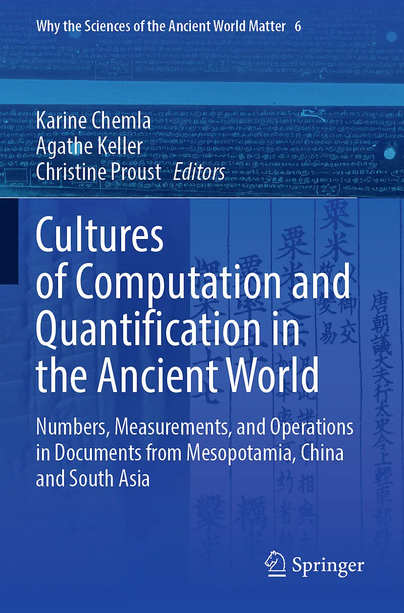 Chapter 1. Cultures of computation and quantification in the ancient world: An introduction (Karine Chemla, in dialogue with Agathe Keller and Christine Proust).- Part 1: Shaping quantities and relating them to numbers.- Chapter 2. Carrying bricks and bundling reed in theory and practice (Wolfgang Heimpel).- Chapter 3. Measuring grain in early Bronze Age Mesopotamia: Form, use, and control of the bariga container in the Twenty-First Century BCE (Walther Sallaberger).- Chapter 4. Volume, brickage and capacity in old Babylonian mathematical texts from Southern Mesopotamia (Christine Proust).- Part 2: Interpreting numbers and quantities in texts.- Place value notations in the Ur III period: Marginal numbers in administrative texts (Ouyang Xiaoli and Christine Proust).- Chapter 6. The Nazbalum in old Babylonian Mesopotamia (Robert Middeke-Conlin).- Part 3. Working with operations and algorithms.- Chapter 7. Computing tools and representations of arithmetic (Baptiste Mélès).- Chapter 8. Working on and with division in early China, Third Century BCESeventh Century CE (Karine Chemla).- Chapter 9. Multiplying integers: On the diverse practices of medieval Sanskrit authors (Agathe Keller and Catherine Morice-Singh).- Part 4. Different cultures of computation and quantification.- Chapter 10. Another culture of computation from 7th century China (Zhu Yiwen).- Chapter 11. The characteristics of mathematical methods in the Wu Cao Suanjing and its social background (Zou Dahai and Chen Wei).- Chapter 12. Weighing units and weights in the context of trade between upper Mesopotamia and Anatolia (Nineteenth and Eighteenth Centuries BCE) (Cécile Michel).- Chapter 13. Quantification and computation in the mathematical texts of old Babylonian Diyala (Carlos Gonçalves).- Index.