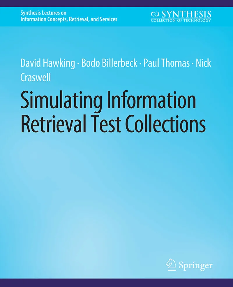 David Hawking is an Honorary Professor in the College of Engineering and Computer Science at the Australian National University in Canberra. His research in Information Retrieval began in the early nineteen-nineties at the Australian National University where he worked on parallel and distributed IR, and proximity models of retrieval. With ANU colleagues, he coordinated the Very Large Collection and Web tracks at TREC and co-created a number of test collections, notably WT10g and VLC2. Between 1998 and 2008 he worked for the government research organisation CSIRO and, with colleagues, developed an internet and enterprise retrieval system which was spun off as Funnelback Pty Ltd. David worked as Chief Scientist for Funnelback until 2013 when he joined Microsoft and worked on the Bing search engine. He retired from paid work in 2018.Bodo Billerbeck is an applied data scientist at Microsoft Bing, working mostly on core search problems. His interests lie in finding often data-driven solutions to multiple problems in the search stack, including indexing, query reformulation, matching, answer selection and insertion, as well as evaluation. Since completing his Ph.D. at RMIT University in 2005 he briefly worked at Sensis.com.au, but soon moved on to Microsoft. After spending some time embedded at Microsoft Research in Cambridge, UK, he returned to Australia, and recently has come full circle and is enjoying an honorary fellow position at RMIT.Paul Thomas is an applied scientist at Microsoft. His research is in information retrieval: particularly in how people use web search systems and how we should evaluate these systems, as well as interfaces for search including search with different types of results, search on mobile devices, and search as conversation. He has previously worked at Australia's CSIRO and the Australian National University.Nick Craswell is a research manager at Microsoft Bing. Since obtaining his Ph.D. from the Australian National University in 2000 on the topic of distributed information retrieval, Nick has worked on enterprise search, expert search, anchor text, click graphs, image search, offline and online evaluation of Web search, query-independent evidence in ranking, evaluation metrics and web ranking and neural ranking models. He has been a driving force in the TREC web tracks and enterprise tracks and was instrumental in creating various widely used test collections.