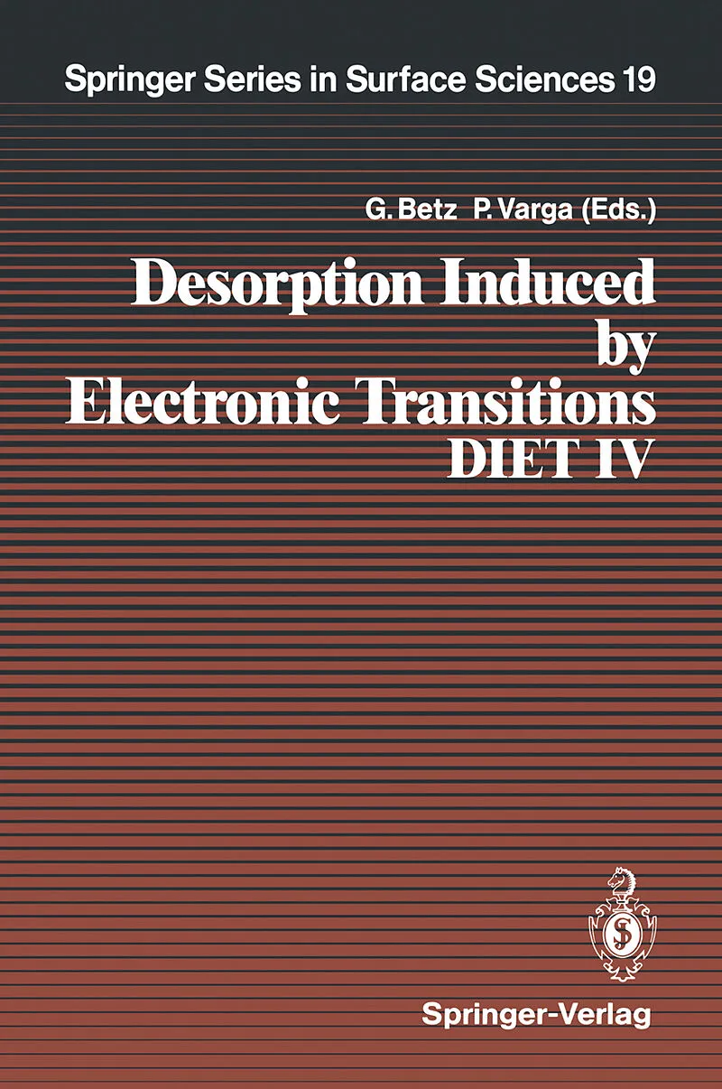 This volume contains the full proceedings of the Fourth International Workshop on "Desorption Induced by Electronic Transitions" (DIET IV), held October 2-4, 1989, at the Burghotel Kranichberg, Gloggnitz, Austria. It followed earlier workshops held i...This volume contains the full proceedings of the Fourth International Workshop on "Desorption Induced by Electronic Transitions" (DIET IV), held October 2-4, 1989, at the Burghotel Kranichberg, Gloggnitz, Austria. It followed earlier workshops held in Williamsburg, USA (1982), SchloB Elmau, FRG (1984), and Shelter Island, USA (1987). The workshop was attended by 77 participants from 9 countries, and 66 papers (8 invited, 24 oral contributions and 34 poster contributions) were pre sented. The proceedings contain 53 separate papers and focus on 8 main topics: (1) Basic Mechanisms and Theory, (2) Photophysics and Photochemistry, (3) Laser Induced Desorption, (4) Adsorbed Layers, (5) Condensed Gases, (6) In sulators, (7) Gas Phase Processes and (8) Applications and Related Processes. The workshop was opened by N. Tolk, who initiated this series of meetings in 1982, and by D. Menzel, who mentioned the 25th birthday of one of the basic processes in DIET, the so-called MGR model, which was first published in 1964. One of the goals of the meeting was to achieve a better understanding and further improved theoretical descriptions of desorption by electronic transitions.