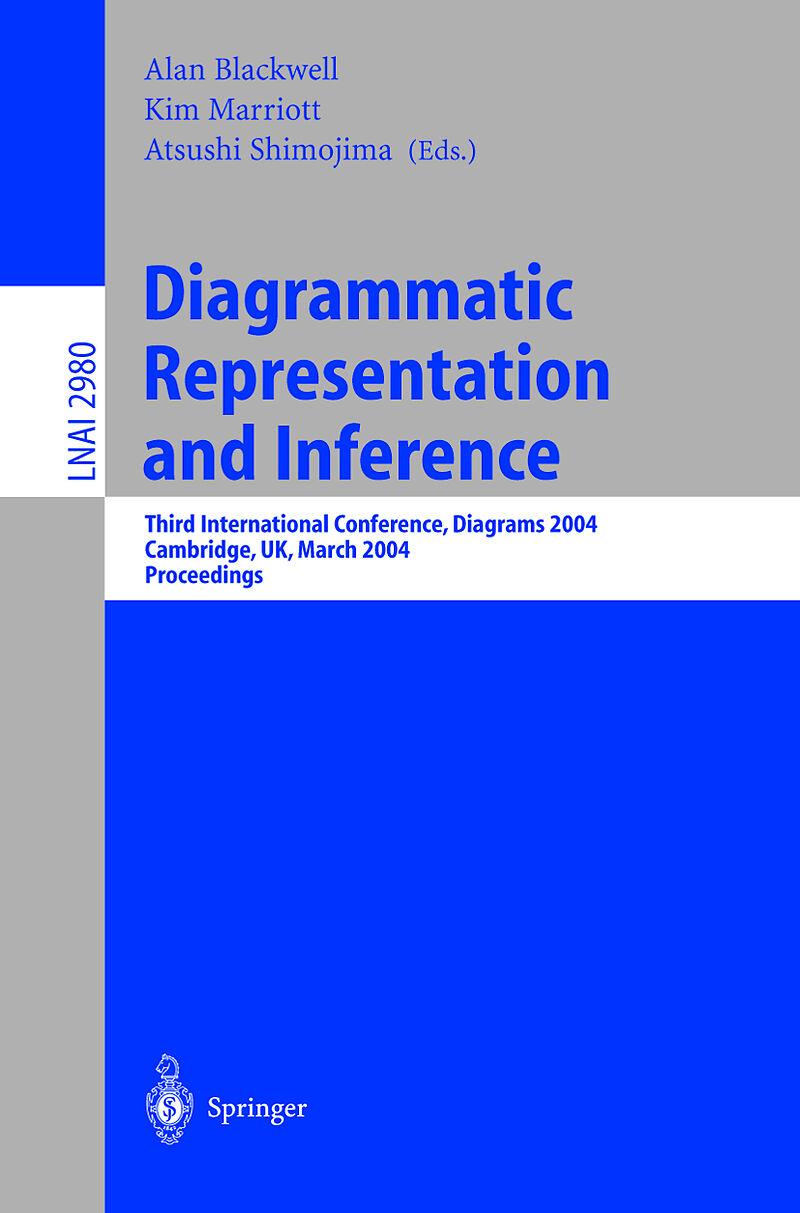 Although diagrammatic representations have been a feature of human com- nication from early history, recent advances in printing and electronic media technologyhaveintroducedincreasinglysophisticatedvisualrepresentationsinto everydaylife. We need to improve ou...Although diagrammatic representations have been a feature of human com- nication from early history, recent advances in printing and electronic media technologyhaveintroducedincreasinglysophisticatedvisualrepresentationsinto everydaylife. We need to improve our understanding of the role of diagramsand sketches in communication, cognition, creative thought, and problem-solving. These concerns have triggered a surge of interest in the study of diagrammatic notations, especially in academic disciplines dealing with cognition, compu- tion, and communication. We believe that the study of diagrammatic communication is best pursued as an interdisciplinary endeavor. The Diagrams conference series was launched to support an international research community with this common goal. After successful meetings in Edinburgh (2000) and Georgia (2002), Diagrams 2004 was the third event in the series. The Diagramsseries attracts a largenumber of researchersfrom virtually all academic?elds who arestudying the nature of d- grammatic representations,their use in human communication, and cognitive or computationalmechanismsforprocessingdiagrams.Bycombiningseveralearlier workshop and symposium series that were held in the US and Europe R- soning with Diagrammatic Representations (DR), US; Thinking with Diagrams (TWD), Europe; and Theory of Visual Languages (TVL), Europe Diagrams has emerged as a major international conference on this topic.
