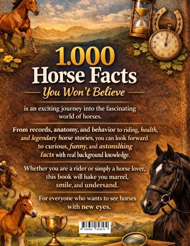 1,000 Horse Facts You Won't Believe is an entertaining and informative horse book for anyone who loves horses and wants to learn more about them. This book combines curious facts, funny anecdotes, and amazing background knowledge with fascinating context ...1,000 Horse Facts You Won't Believe is an entertaining and informative horse book for anyone who loves horses and wants to learn more about them. This book combines curious facts, funny anecdotes, and amazing background knowledge with fascinating context from biology, history, equestrian sports, and horse care.Whether you already ride, feel at home in the stable, own a horse, or are simply a huge horse fan, this book offers 1,000 astonishing horse facts that will make you marvel, smile, and think. It covers not only familiar topics such as riding or horse breeds, but also surprising details that even experienced horse lovers often do not know.Among other things, you will discover fascinating facts about:Horse records (size, speed, endurance, age)The evolution and history of the horseHorse breeds around the world and their special characteristicsAnatomy, senses, and remarkable abilitiesBehavior, body language, and communicationIntelligence, learning, and trainingFeeding, digestion, and stable mythsHealth, prevention, and first aidHooves, hoof care, and equipmentRiding, dressage, jumping, western riding, and horse racingFamous horses, historical uses, and incredible horse storiesThis horse fact book is ideal for readers who want to experience horse knowledge in a way that is both easy to understand and exciting. It also makes a wonderful gift for horse lovers, riders, stable owners, lease riders, teenagers, and adults interested in horse knowledge, horse care, and equestrian sport.Instead of dry theory, you get a book full of aha moments that shows just how fascinating, sensitive, intelligent, and capable horses really are. Many of the facts will also help you understand horses better-from their body language and herd behavior to physical characteristics and common misunderstandings in handling.Why this book?Because it is more than just a collection of facts: it is an exciting journey through the world of horses-from records and breeds to anatomy and health, all the way to riding knowledge, horse care, and legendary stories.For everyone who wants to see horses with new eyes.