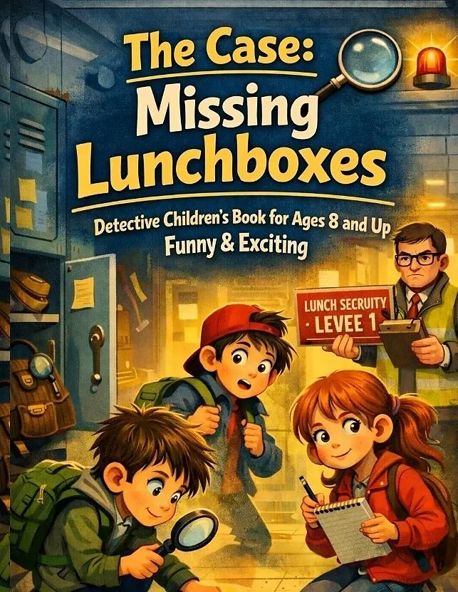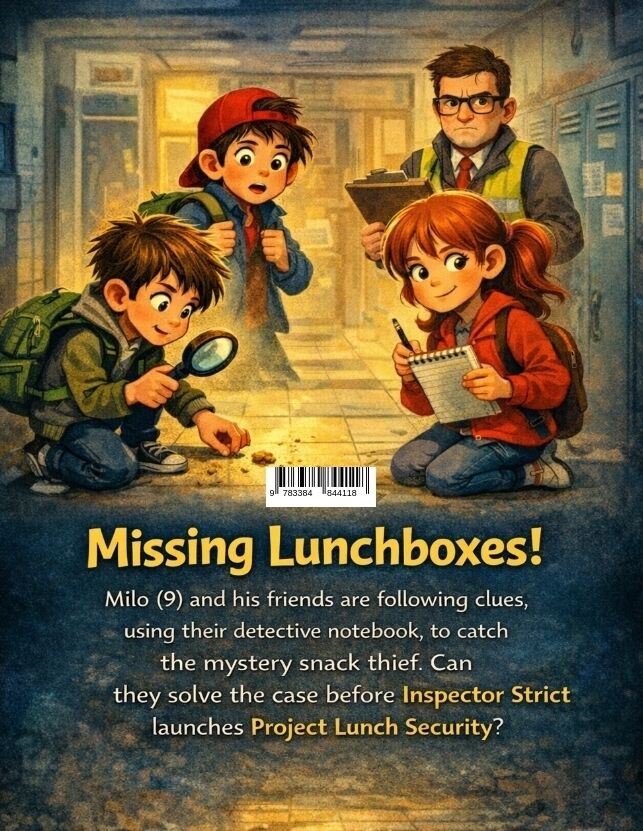 In "The Case: Missing Lunchboxes", an ordinary school morning at Regelberg Elementary suddenly turns into a full-blown mystery. What begins as one missing lunch quickly becomes a strange case of disappearing snacks, suspicious rules, and a hallway fu...In "The Case: Missing Lunchboxes", an ordinary school morning at Regelberg Elementary suddenly turns into a full-blown mystery. What begins as one missing lunch quickly becomes a strange case of disappearing snacks, suspicious rules, and a hallway full of clues. This is a funny and exciting detective children's book for ages 8 and up, packed with school chaos, teamwork, and a mystery that keeps young readers turning the pages.Milo Mertens (9) notices right away that something is wrong: his lunchbox is gone. Not misplaced. Not forgotten. Gone. A few minutes later, his friend Tarik "Turbo" Tan discovers that his emergency banana has also vanished. Two missing snacks in just a few minutes? Milo knows this is no coincidence. It is a case.Together with their sharp and super-organized friend Fina Fuchs, who is always ready with her notebook and quick observations, the three kids launch their own investigation. They search lockers, scan the hallway for clues, and begin collecting evidence. Crumbs on the floor, strange timing, nervous reactions, and too many new rules all point to one thing: someone is hiding something.Then things get even stranger when Inspector Dr. Ordnung from the "Office for Quiet & Rules" appears with his clipboard, warning vest, and a brand-new sign announcing LUNCH SECURITY - LEVEL 1. Suddenly, there are new procedures, new restrictions, and a suspicious "Project Lunch Security" that seems to appear exactly when the lunchboxes start disappearing. Coincidence? Milo, Fina, and Turbo do not think so.As the mystery grows, the three young detectives must work together to follow clues, ask the right questions, and stay one step ahead of the adults. Who is stealing the lunches? Why are the rules getting stricter? And what is really behind Project Lunch Security? With every clue, the case becomes funnier, trickier, and more exciting."The Case: Missing Lunchboxes" is a lively mix of kids mystery, detective adventure, and funny school story. It combines humor, suspense, friendship, and child-friendly investigation in a way that is perfect for young readers. The story is full of memorable characters, playful tension, and clever moments that encourage kids to think, observe, and solve the mystery along with the heroes.This book is ideal for children who love:* detective books for kids* funny mystery books for ages 8-12* school adventure stories* chapter books with humor and suspense* friendship and teamwork stories* read-aloud books for families and classroomsIt is perfect for independent reading and also great as a read-aloud for parents, grandparents, and teachers looking for a fun, engaging story with strong characters and a kid-friendly mystery.If your child enjoys detective stories, school mysteries, funny chapter books, and exciting adventures, "The Case: Missing Lunchboxes" is a great choice. A missing lunchbox is only the beginning-because at Regelberg Elementary, even snack time can become an unforgettable case.