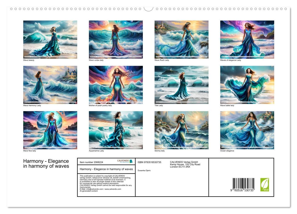 Welcome to the future of art and aesthetics. Our AI-created calendar presents you with the perfect fusion of elegance and the power of nature. Each image shows an elegant woman in a stunning dress that harmonises with the gentle or wild ocean waves. Be mesmeri...