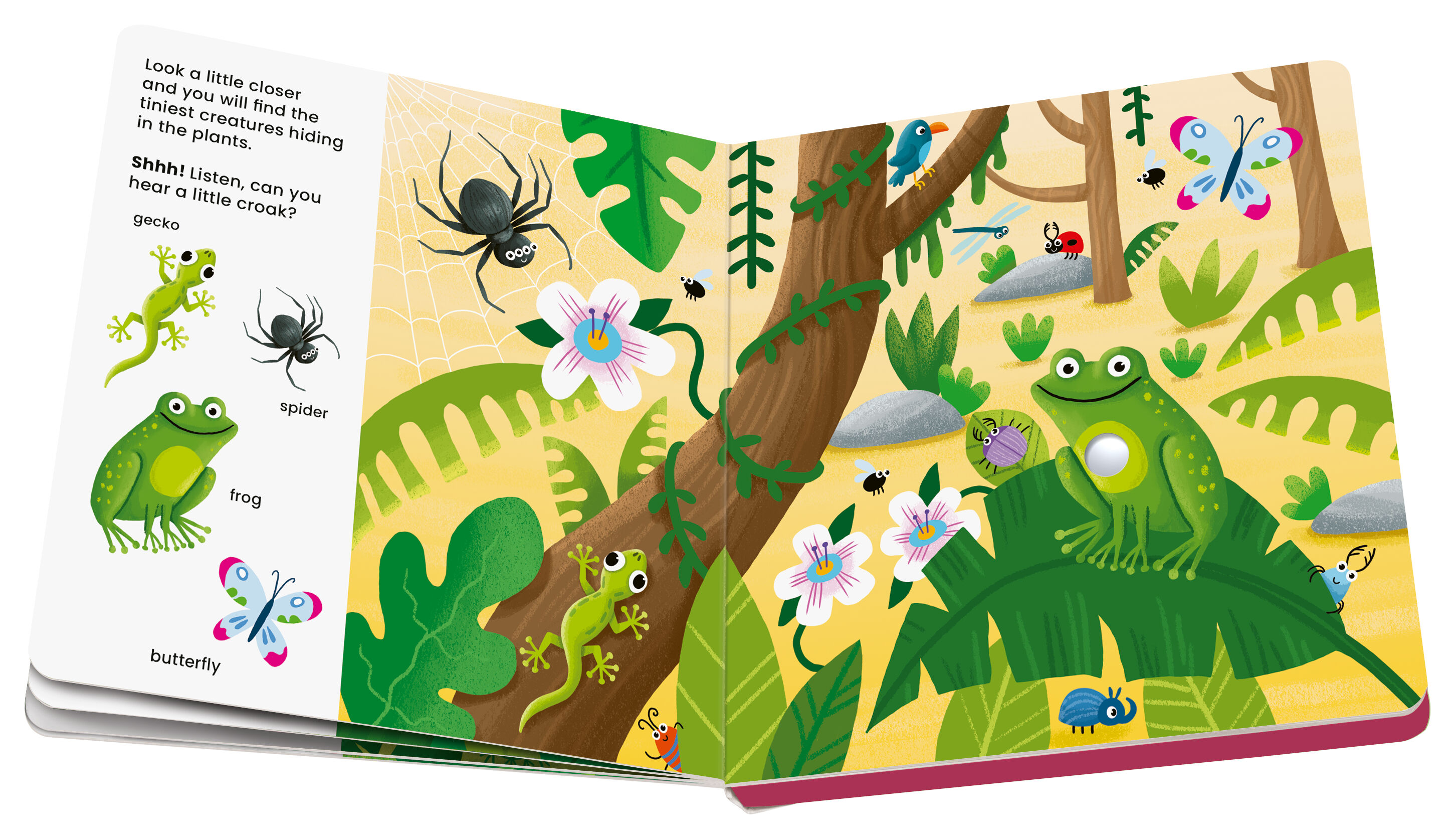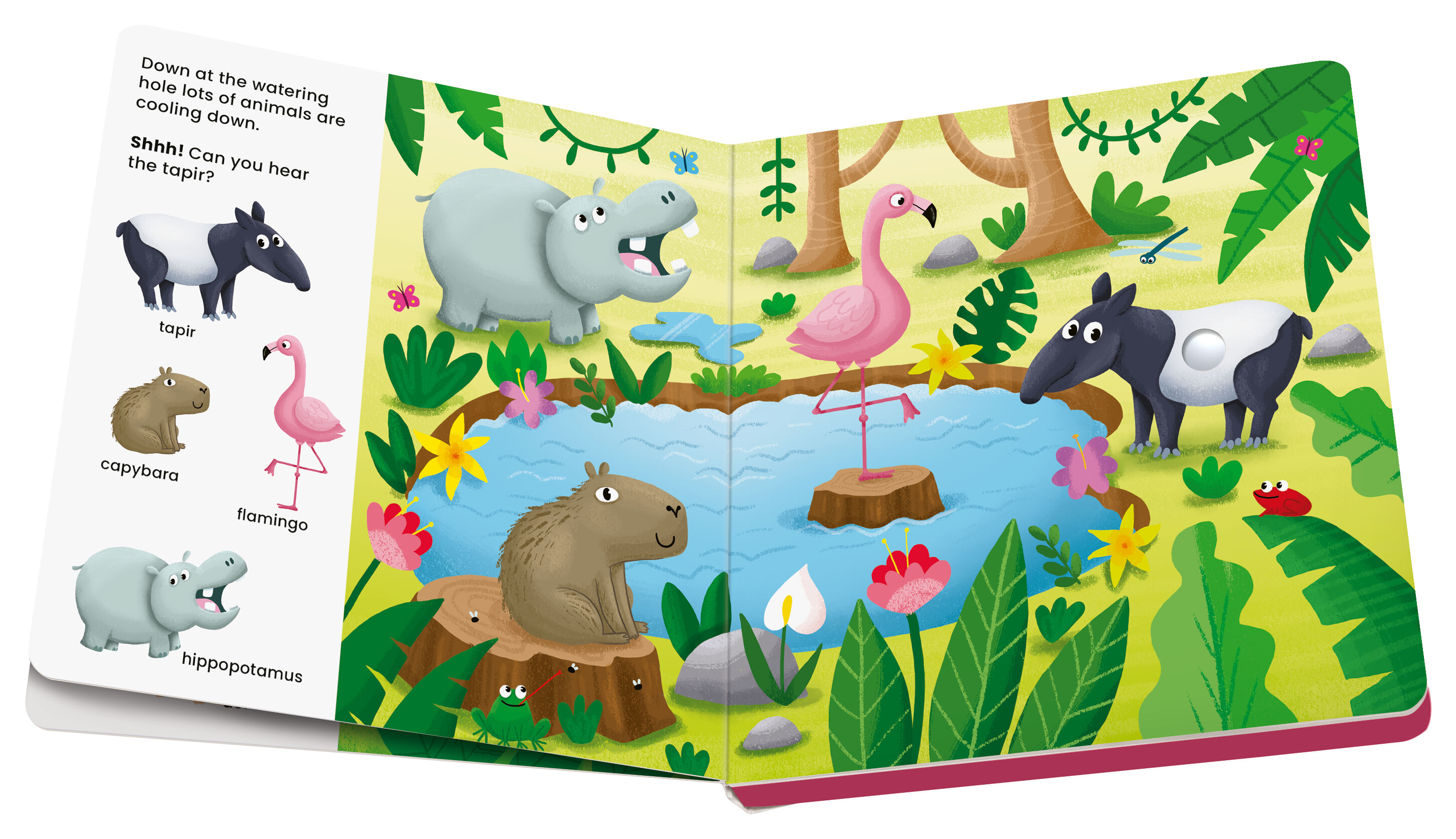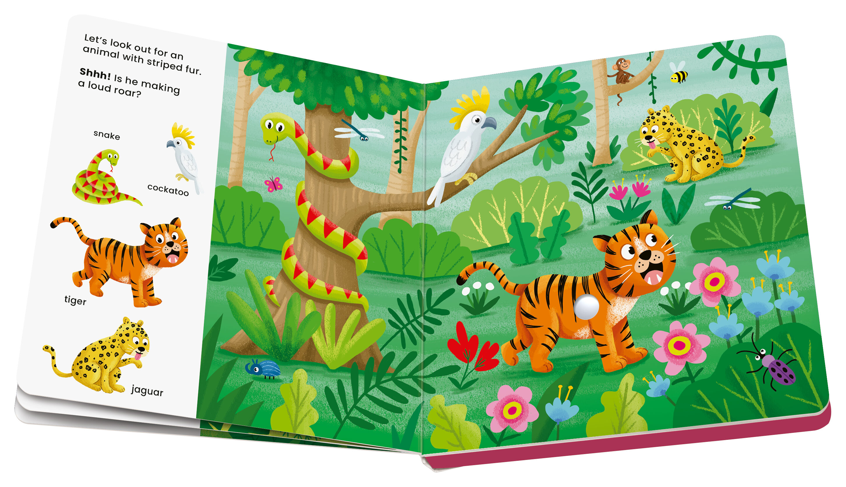 Who's making that loud noise? Where is the tiger hiding? This search and find sound book is packed with animals to find. As you explore the jungle in this 12-page baby book, children will love to press the buttons to hear the five different animal sounds. ShhW...