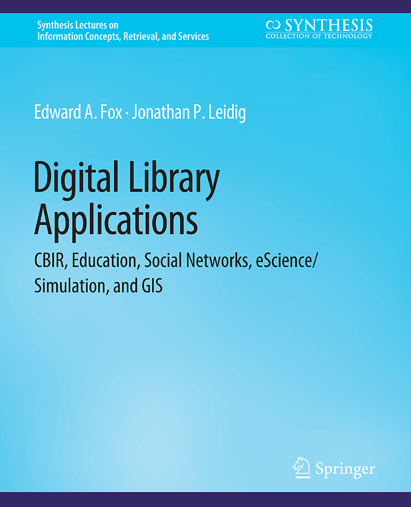 Digital libraries (DLs) have evolved since their launch in 1991 into an important type of information system, with widespread application. This volume advances that trend further by describing new research and development in the DL field that builds upon the 5...Digital libraries (DLs) have evolved since their launch in 1991 into an important type of information system, with widespread application. This volume advances that trend further by describing new research and development in the DL field that builds upon the 5S (Societies, Scenarios, Spaces, Structures, Streams) framework, which is discussed in three other DL volumes in this series.While the 5S framework may be used to describe many types of information systems, and is likely to have even broader utility and appeal, we focus here on digital libraries. Drawing upon six (Akbar, Kozievitch, Leidig, Li, Murthy, Park) completed and two (Chen, Fouh) in-process dissertations, as well as the efforts of collaborating researchers, and scores of related publications, presentations, tutorials, and reports, this book demonstrates the applicability of 5S in five digital library application areas, that also have importance in the context of the WWW, Web 2.0, and innovative information systems. By integrating surveys of the state-of-the-art, newresearch, connections with formalization, case studies, and exercises/projects, this book can serve as a textbook for those interested in computing, information, and/or library science. Chapter 1 focuses on images, explaining how they connect with information retrieval, in the context of CBIR systems. Chapter 2 gives two case studies of DLs used in education, which is one of the most common applications of digital libraries. Chapter 3 covers social networks, which are at the heart of work onWeb 2.0, explaining the construction and use of deduced graphs, that can enhance retrieval and recommendation. Chapter 4 demonstrates the value of DLs in eScience, focusing, in particular, on cyber-infrastructure for simulation. Chapter 5 surveys geospatial information in DLs, with a case study on geocoding. Given this rich content, we trust that any interested in digital libraries, or in related systems, will find this volume to be motivating, intellectually satisfying, and useful. We hope it will help move digital libraries forward into a science as well as a practice. We hope it will help build community that will address the needs of the next generation of DLs.