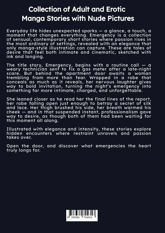 Everyday life hides unexpected sparks a glance, a touch, a moment that changes everything. Emergency is a collection of sensual, contemporary short stories where passion rises in the most ordinary of settings, revealed with an elegance that only manga-style il...Everyday life hides unexpected sparks a glance, a touch, a moment that changes everything. Emergency is a collection of sensual, contemporary short stories where passion rises in the most ordinary of settings, revealed with an elegance that only manga-style illustration can capture. These are tales of desire that feel both intimate and cinematic, sketched with ink and longing. The title story, Emergency, begins with a routine call a weary technician sent to fix a gas meter after a late-night scare. But behind the apartment door awaits a woman trembling from more than fear. Wrapped in a robe that conceals as much as it reveals, her nervous laughter gives way to bold invitation, turning the night's emergency into something far more intimate, charged, and unforgettable. She leaned closer as he read her the final lines of the report, her robe falling open just enough to betray a secret of silk and lace. Her thigh brushed his side, her breath warmed his cheek and in that suspended instant, professionalism gave way to desire, as though both of them had been waiting for this moment all along. Illustrated with elegance and intensity, these stories explore hidden encounters where restraint unravels and passion takes over. Open the door, and discover what emergencies the heart truly longs for.