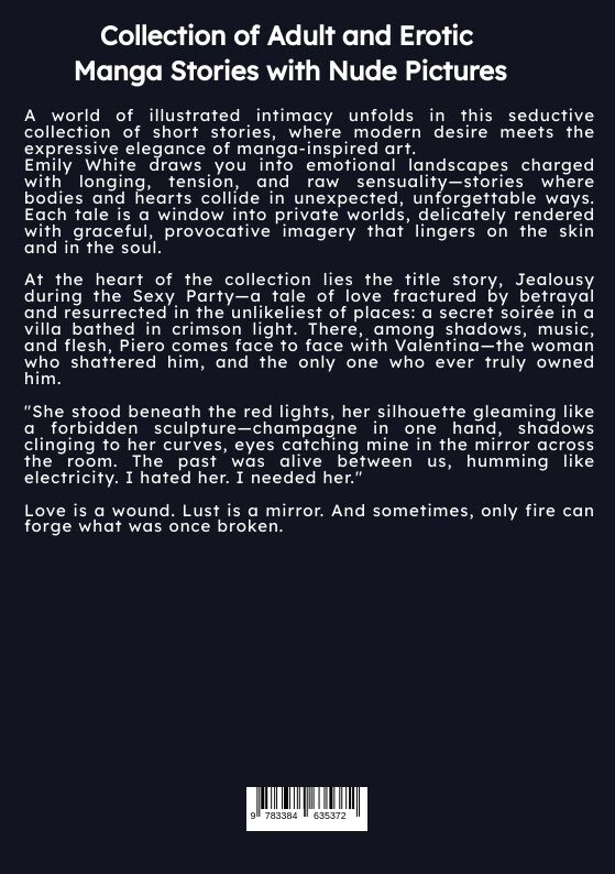 A world of illustrated intimacy unfolds in this seductive collection of short stories, where modern desire meets the expressive elegance of manga-inspired art. Emily White draws you into emotional landscapes charged with longing, tension, and raw sensualitysto...A world of illustrated intimacy unfolds in this seductive collection of short stories, where modern desire meets the expressive elegance of manga-inspired art. Emily White draws you into emotional landscapes charged with longing, tension, and raw sensualitystories where bodies and hearts collide in unexpected, unforgettable ways. Each tale is a window into private worlds, delicately rendered with graceful, provocative imagery that lingers on the skin and in the soul. At the heart of the collection lies the title story, Jealousy during the Sexy Partya tale of love fractured by betrayal and resurrected in the unlikeliest of places: a secret soirée in a villa bathed in crimson light. There, among shadows, music, and flesh, Piero comes face to face with Valentinathe woman who shattered him, and the only one who ever truly owned him. "She stood beneath the red lights, her silhouette gleaming like a forbidden sculpturechampagne in one hand, shadows clinging to her curves, eyes catching mine in the mirror across the room. The past was alive between us, humming like electricity. I hated her. I needed her." Love is a wound. Lust is a mirror. And sometimes, only fire can forge what was once broken.