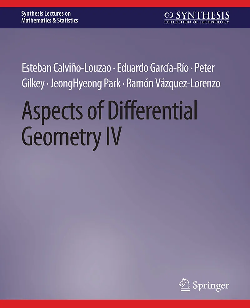 Esteban is a member of the research group in Riemannian Geometry at the Department of Geometry and Topology of the University of Santiago de Compostela (Spain). He received his Ph.D. in 2011 under the direction of E. Garcia-Rio and R. Vazquez-Lorenzo. His research specialty is Riemannian and pseudo-Riemannian geometry. He has published more than 20 research articles and books.Eduardo is a Professor of Mathematics at the University of Santiago (Spain). He is a member of the editorial board of Differential Geometry and its Applications and The Journal of Geometric Analysis and leads the research group in Riemannian Geometry at the Department of Geometry and Topology of the University of Santiago de Compostela (Spain). He received his Ph.D. in 1992 from the University of Santiago under the direction of A. Bonome and L. Torron. His research specialty is Differential Geometry. He has published more than 120 research articles and booksPeter is a Professor of Mathematics and amember of the Institute of Theoretical Science at the University of Oregon. He is a fellow of the American Mathematical Society and is a member of the editorial board of Results in Mathematics, Differential Geometry and its Applications, and The Journal of Geometric Analysis. He received his Ph.D. in 1972 from Harvard University under the direction of L. Nirenberg. His research specialties are Differential Geometry, Elliptic Partial Differential Equations, and Algebraic topology. He has published more than 260 research articles and books.JeongHyeong is a Professor of Mathematics at Sungkyunkwan University and is an associate member of he KIAS Korea).She received her Ph.D. in 1990 from Kanazawa University in Japan under the direction of H. Kitahara. Her research specialties are spectral geometry of Riemannian submersion and geometric structures on manifolds like eta-Einstein manifolds and H-contact manifolds. She organized the geometry section of AMC 2013 (The Asian Mathematical Conference 2013), the ICM 2014 satellite conference on Geometric analysis, and geometric structures on manifolds (2016). She has published more than 81 research articles and books.Ramon is a member of the research group in Riemannian Geometry at the Department of Geometry and Topology of the University of Santiago de Compostela (Spain). He is a member of the Spanish Research Network on Relativity and Gravitation. He received his Ph.D. in 1997 from the University of Santiago de Compostela under the direction of E. Garcia-Rio. His research focuses mainly on Differential Geometry with special emphasis on the study of the curvature and the algebraic properties of curvature operators in the Lorentzian and in the higher signature settings. He has published more than 50 research articles and books.