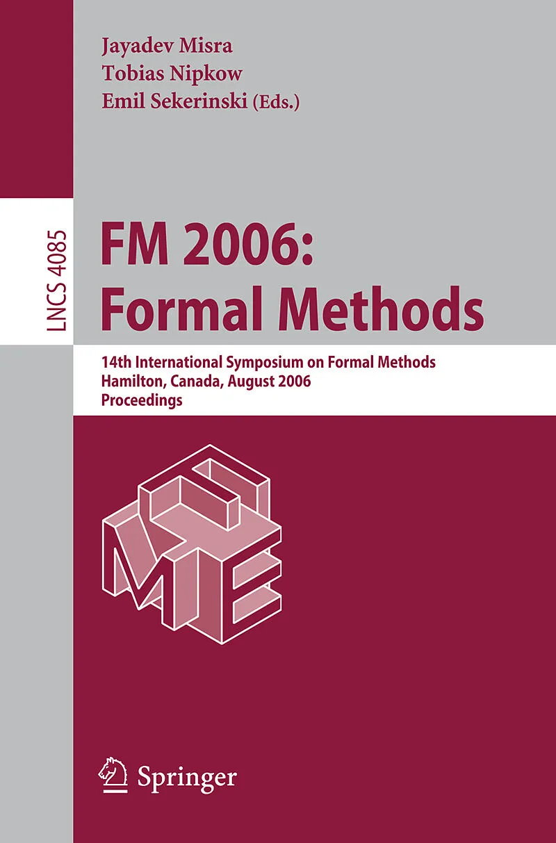 Invited Talk.- The Embedded Systems Design Challenge.- Interactive Verification.- The Mondex Challenge: Machine Checked Proofs for an Electronic Purse.- Interactive Verification of Medical Guidelines.- Certifying Airport Security Regulations Using the Focal Environment.- Proving Safety Properties of an Aircraft Landing Protocol Using I/O Automata and the PVS Theorem Prover: A Case Study.- Invited Talk.- Validating the Microsoft Hypervisor.- Formal Modelling of Systems.- Interface Input/Output Automata.- Properties of Behavioural Model Merging.- Automatic Translation from Circus to Java.- Quantitative Refinement and Model Checking for the Analysis of Probabilistic Systems.- Real Time.- Modeling and Validating Distributed Embedded Real-Time Systems with VDM++.- Towards Modularized Verification of Distributed Time-Triggered Systems.- Industrial Experience.- A Story About Formal Methods Adoption by a Railway Signaling Manufacturer.- Partially Introducing Formal Methods into Object-Oriented Development: Case Studies Using a Metrics-Driven Approach.- Specification Refinement.- Compositional Class Refinement in Object-Z.- A Proposal for Records in Event-B.- Pointfree Factorization of Operation Refinement.- A Formal Template Language Enabling Metaproof.- Progrmming Languages.- Dynamic Frames: Support for Framing, Dependencies and Sharing Without Restrictions.- Type-Safe Two-Level Data Transformation.- Algebra.- Feature Algebra.- Education.- Using Domain-Independent Problems for Introducing Formal Methods.- Formal Modelling of Systems.- Compositional Binding in Network Domains.- Formal Modeling of Communication Protocols by Graph Transformation.- Feature Specification and Static Analysis for Interaction Resolution.- A Fully General Operational Semantics for UML 2.0 SequenceDiagrams with Potential and Mandatory Choice.- Formal Aspects of Java.- Towards Automatic Exception Safety Verification.- Enforcer Efficient Failure Injection.- Automated Boundary Test Generation from JML Specifications.- Formal Reasoning About Non-atomic Java Card Methods in Dynamic Logic.- Programming Languages.- Formal Verification of a C Compiler Front-End.- A Memory Model Sensitive Checker for C#.- Changing Programs Correctly: Refactoring with Specifications.- Mechanical Verification of Recursive Procedures Manipulating Pointers Using Separation Logic.- Model Checking.- Model-Based Variable and Transition Orderings for Efficient Symbolic Model Checking.- Exact and Approximate Strategies for Symmetry Reduction in Model Checking.- Monitoring Distributed Controllers: When an Efficient LTL Algorithm on Sequences Is Needed to Model-Check Traces.- PSL Model Checking and Run-Time Verification Via Testers.- Industry Day: Abstracts of Invited Talks.- Formal Methods for Security: Lightweight Plug-In or New Engineering Discipline.- Formal Methods in the Security Business: Exotic Flowers Thriving in an Expanding Niche.- Connector-Based Software Development: Deriving Secure Protocols.- Model-Based Security Engineering for Real.- Cost Effective Software Engineering for Security.- Formal Methods and Cryptography.- Verified Software Grand Challenge.