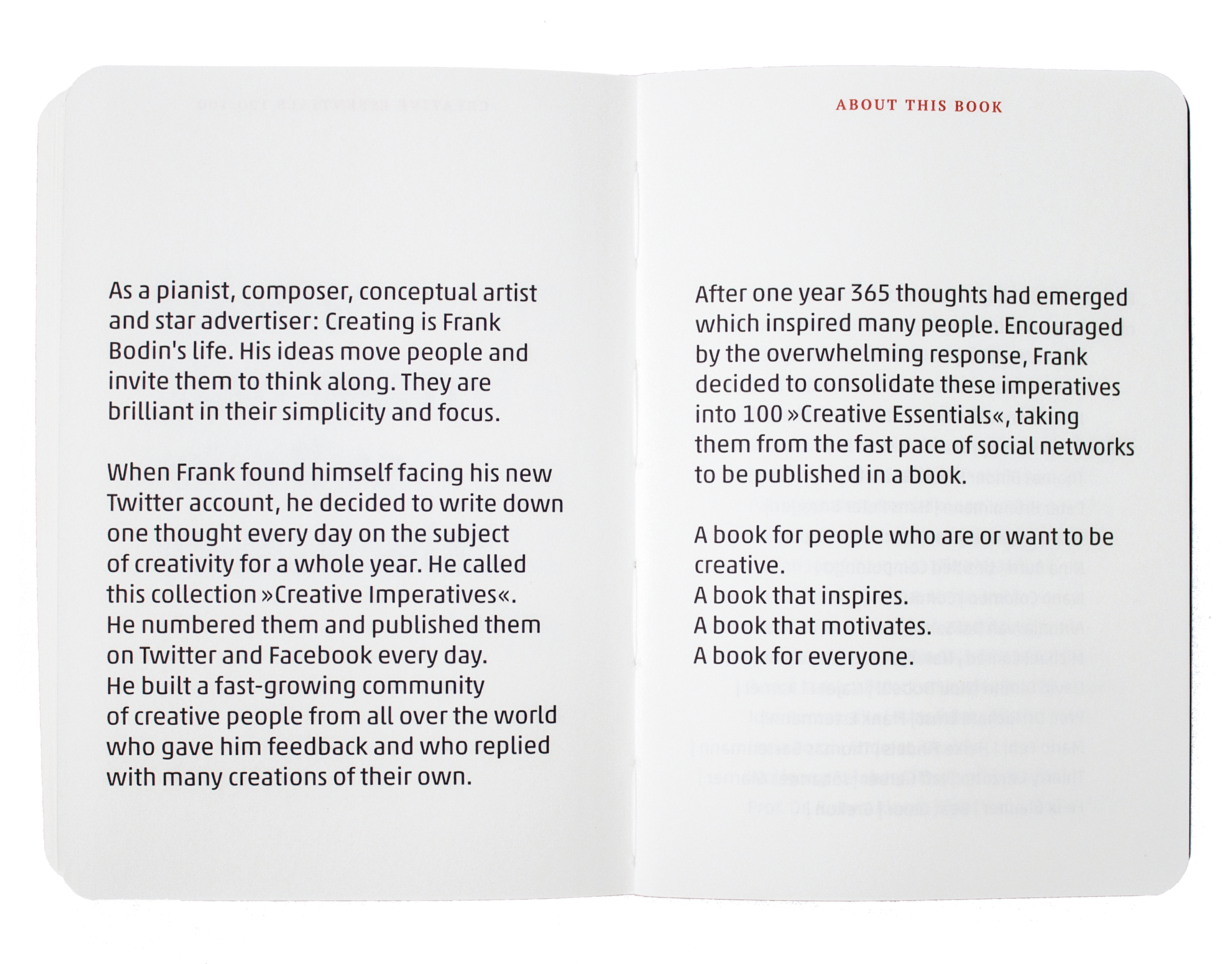 Dem Geheimnis der Kreativität auf der Spur - Frank Bodin verrät seine 100 Creative Essentials. Er ist Chairman und CEO von Havas Worldwide Switzerland, Präsident des Schweizer Art Direktors Club, war Werber des Jahres. Awards und Auszeichnungen säumen seinen W...